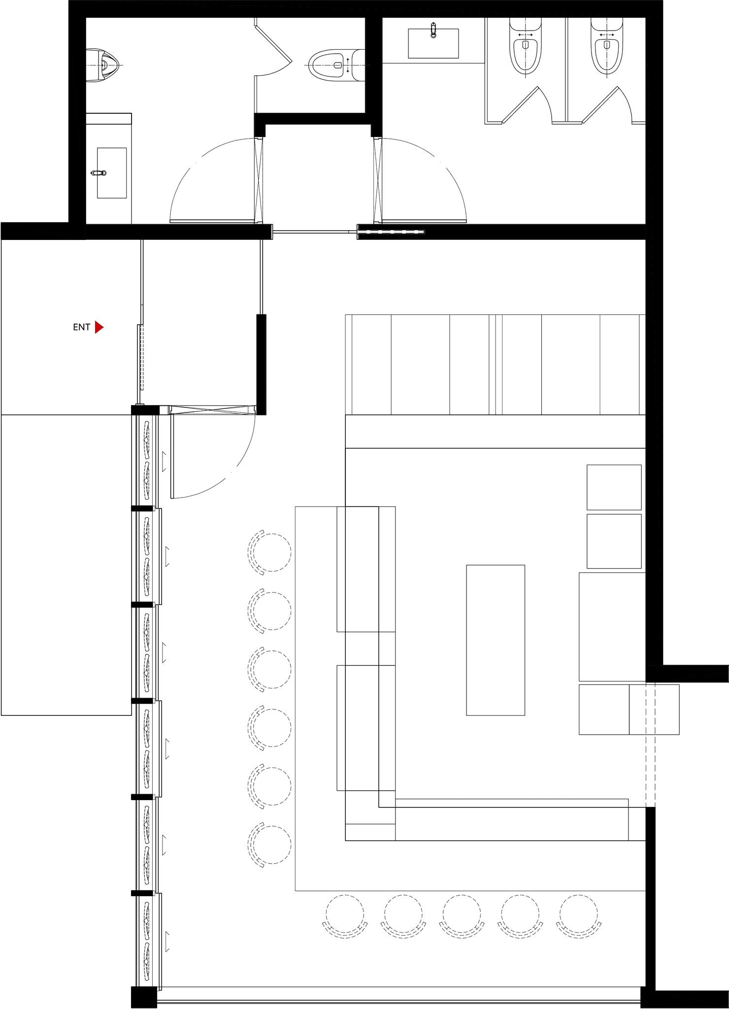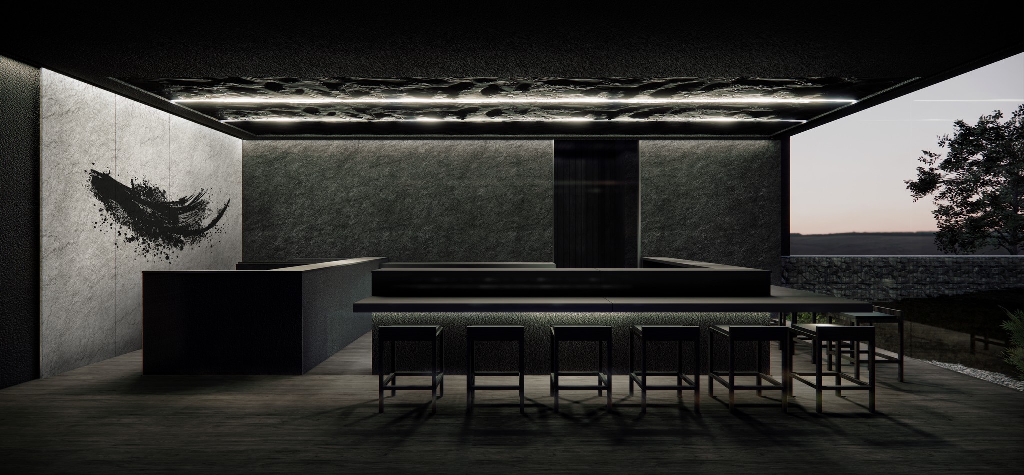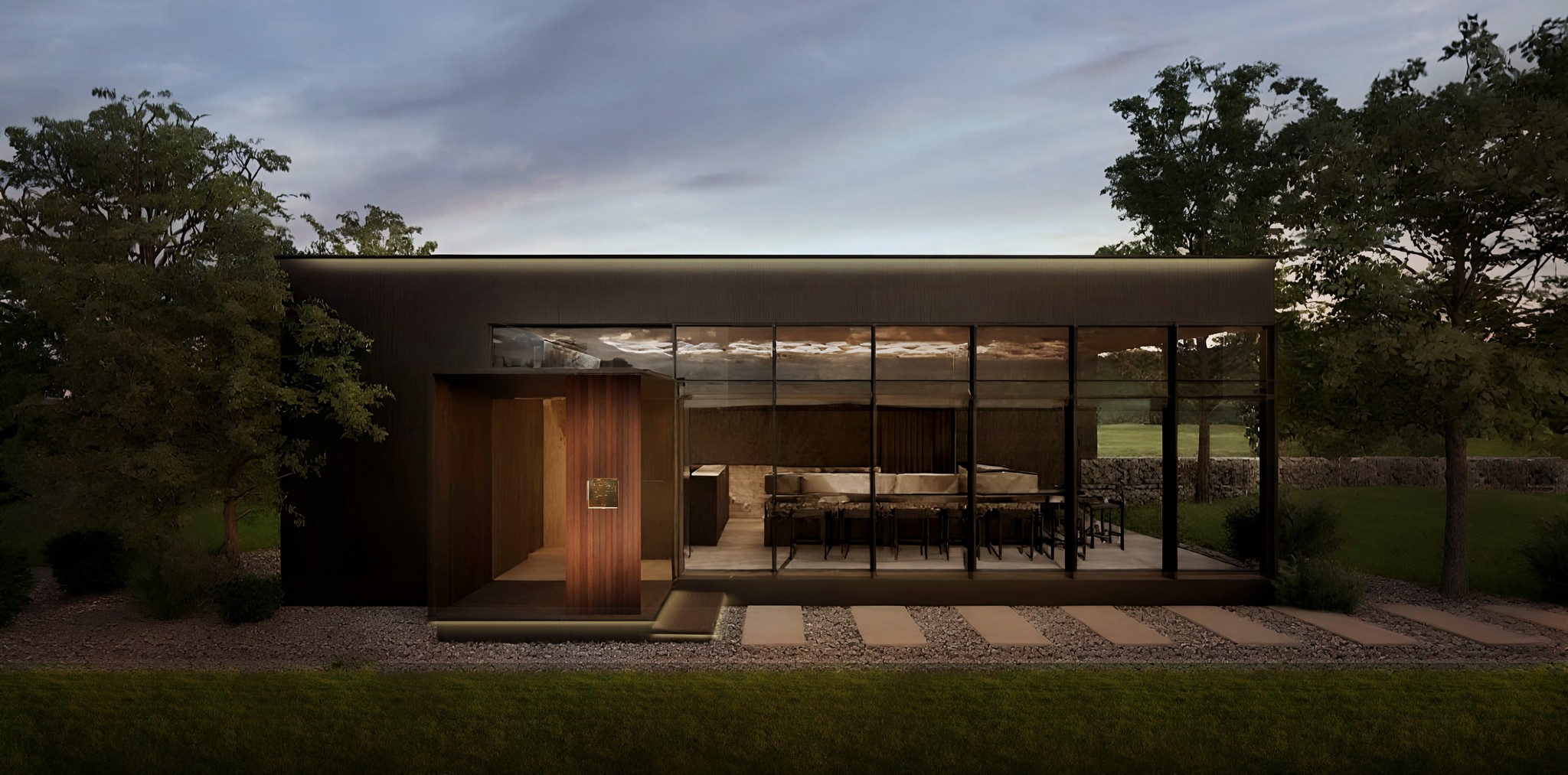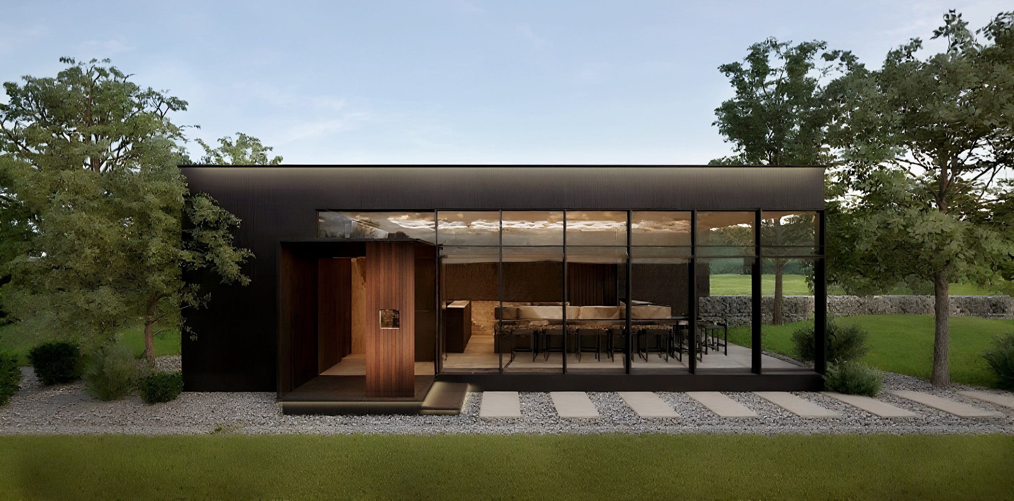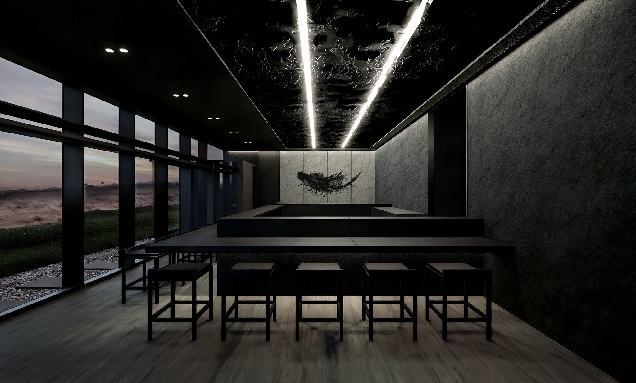 오늘날 미식 경험은 단순히 맛있는 음식을 넘어, 공간이 주는 감각적 자극과 스토리가 결합된 총체적인 예술의 영역으로 진화하고 있습니다. 제주에 자리한 이 돼지고기 오마카세 전문점은 이러한 미식 트렌드의 정점에 서서, '숨겨진 보석'과도 같은 공간을 통해 방문객에게 잊지 못할 여정을 선사합니다.이 건축물은 일반적인 돼지고기 전문점 뒤편에 감춰진, 별도의 프라이버시 통로를 통해서만 접근 가능한 오마카세 공간을 품고 있습니다. 마치 비밀스러운 갤러리의 입구처럼, 오마카세 전용 입구는 극도로 절제된 형태와 색상으로 방문객을 맞이합니다. 검은색빛을 띄는 무광택 외벽은 주변 제주의 자연 풍경 속에 고요히 녹아들면서도, 그 안에 숨겨진 특별한 세계를 은밀히 암시합니다. 불필요한 장식 없이 단순한 직육면체 형태를 유지하는 이 외관은 '오마카세'라는 본질에 집중하는 철학을 시각적으로 구현합니다. 밝은 자연광 아래 더욱 도드라지는 이 어두운 매스는 시각적 대비를 통해 방문객의 시선을 강렬하게 끌어당기며, 동시에 내부 공간으로의 심리적 몰입을 유도하는 섬세한 장치로 작용합니다.건물 전면의 상당 부분을 차지하는 대형 유리 파사드는 어두운 외벽과 대조적으로 내부 공간의 실루엣을 부드럽게 드러냅니다. 이는 내부의 조명과 움직임이 외부로 비쳐지며 마치 살아있는 예술 작품처럼 연출됩니다. 이 차분한 매스 속에서 단연 돋보이는 것은 따뜻한 톤의 목재로 돌출된 출입구입니다. 어두운 배경과의 극적인 대비는 이 문이 단순한 통로가 아닌, 특별한 미식 경험으로 이끄는 '환대의 상징'임을 강조합니다. 섬세하게 깔린 자갈과 석재 디딤돌은 발걸음 하나하나에 정갈함을 더하며, 방문객을 미지의 세계로 인도하는 조용한 길잡이가 됩니다.
