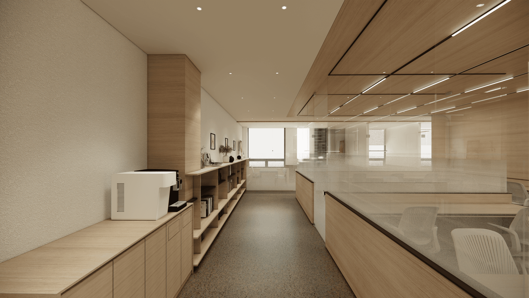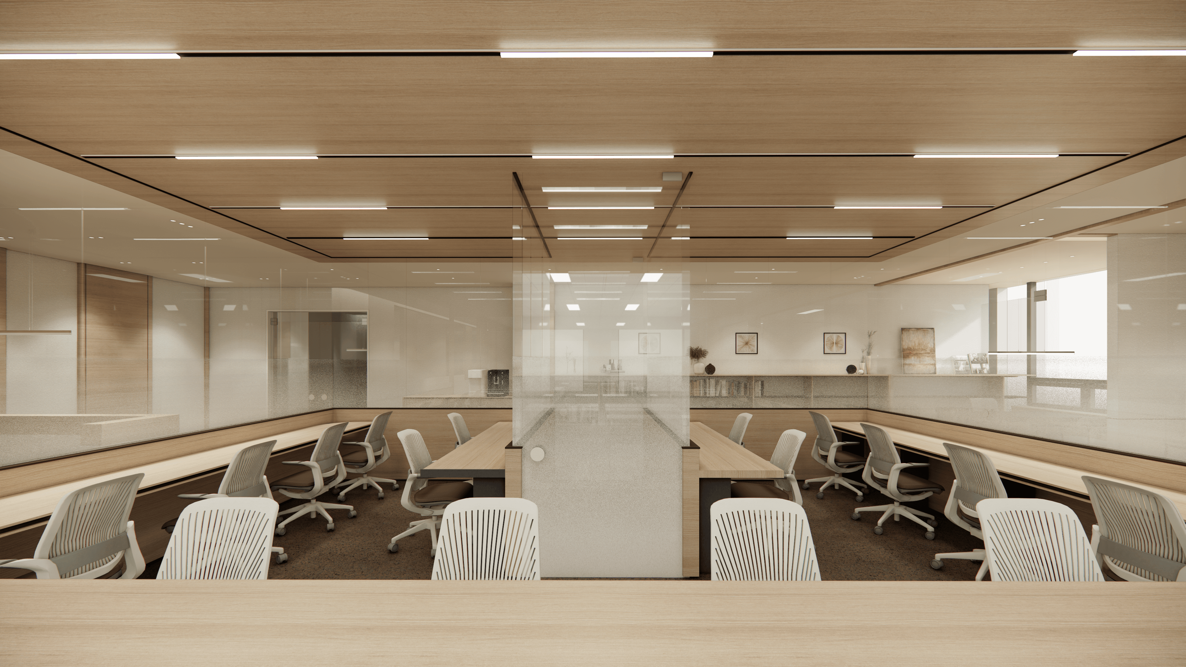 유리 파티션으로 개방감을 유지하면서도 차분한 분위기를 조성한다.
