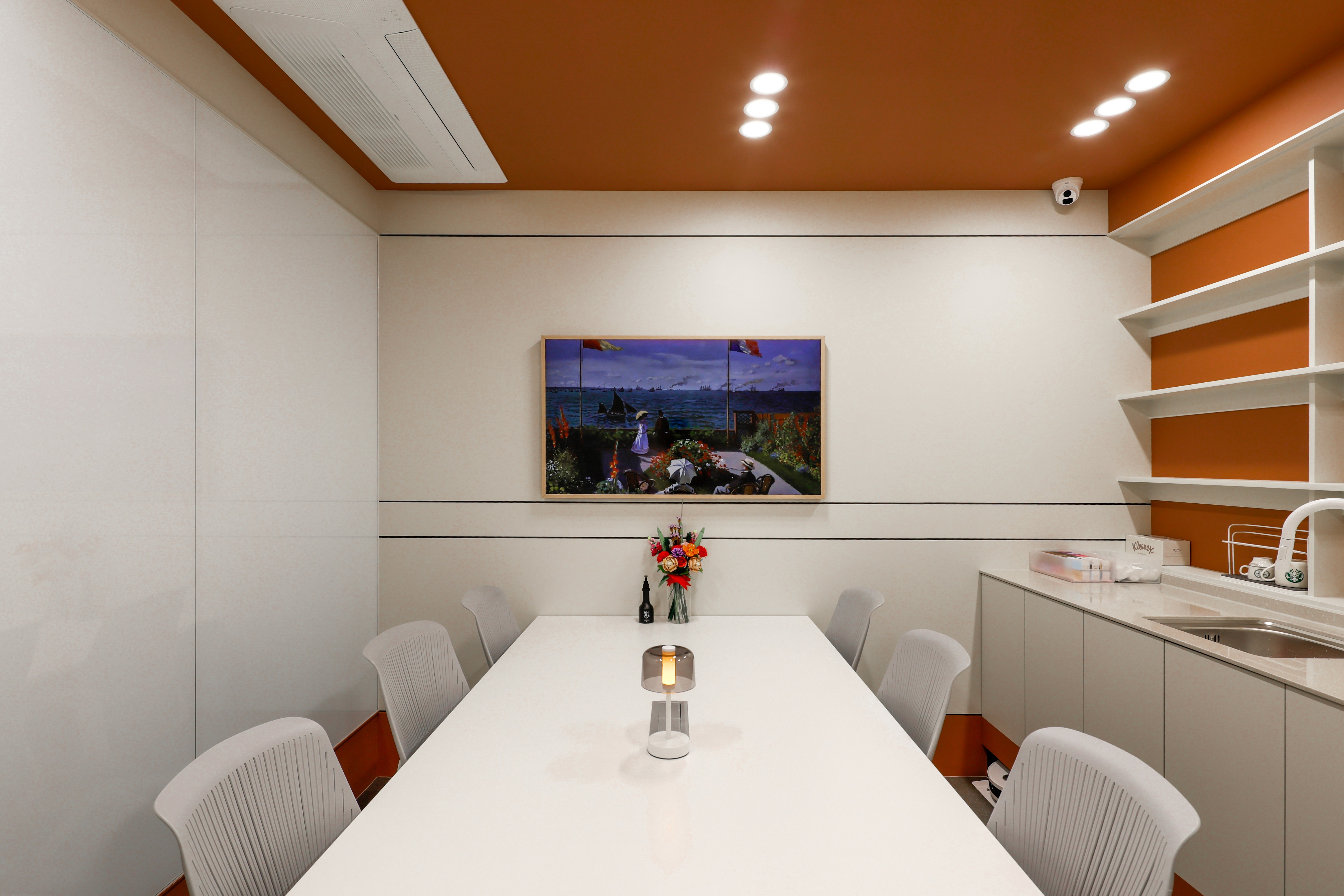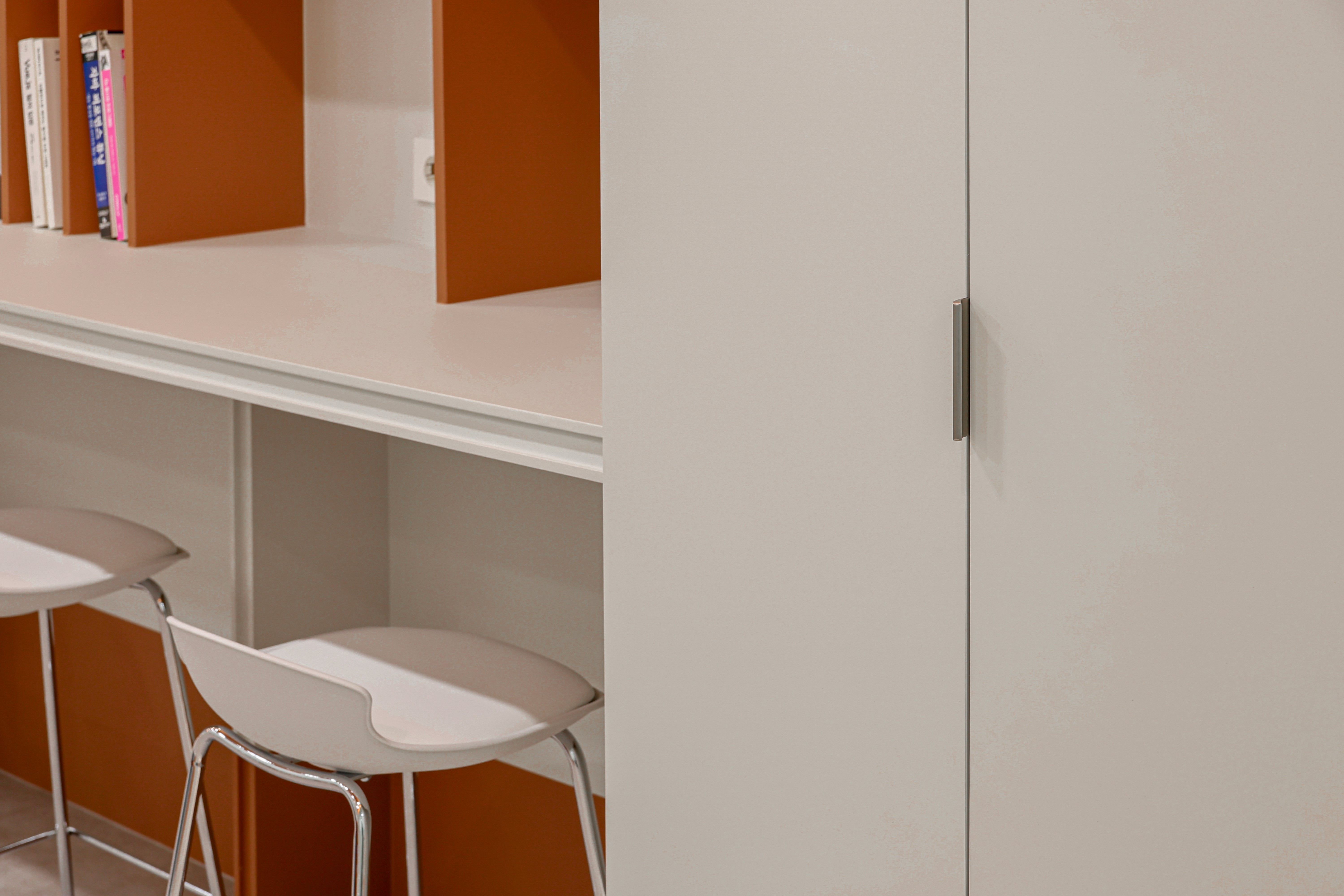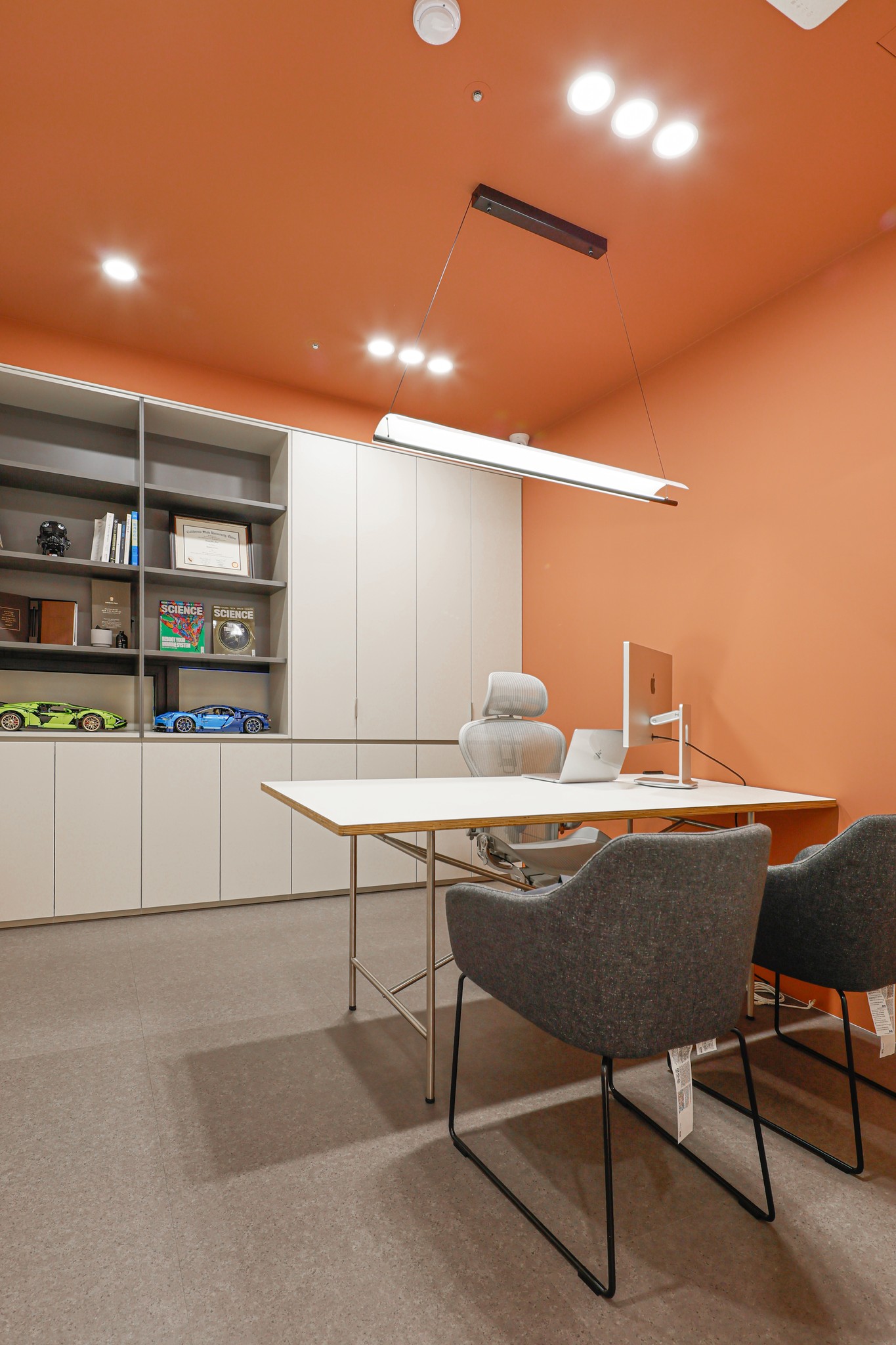 공간은 오렌지 컬러의 대비를 통해 몰입의 리듬을 조율하며,