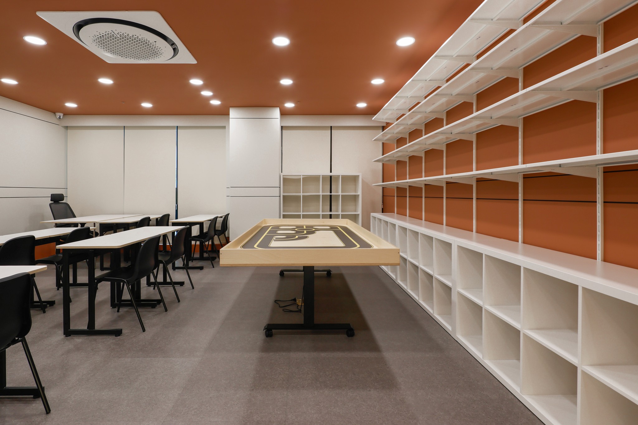 가벼운 곡선과 매트한 마감은 기능성과 미감을 동시에 품으며, 가운데 배치된 로봇 주행 테이블은 공간의 중심이자 학습의 무대를 상징한다.