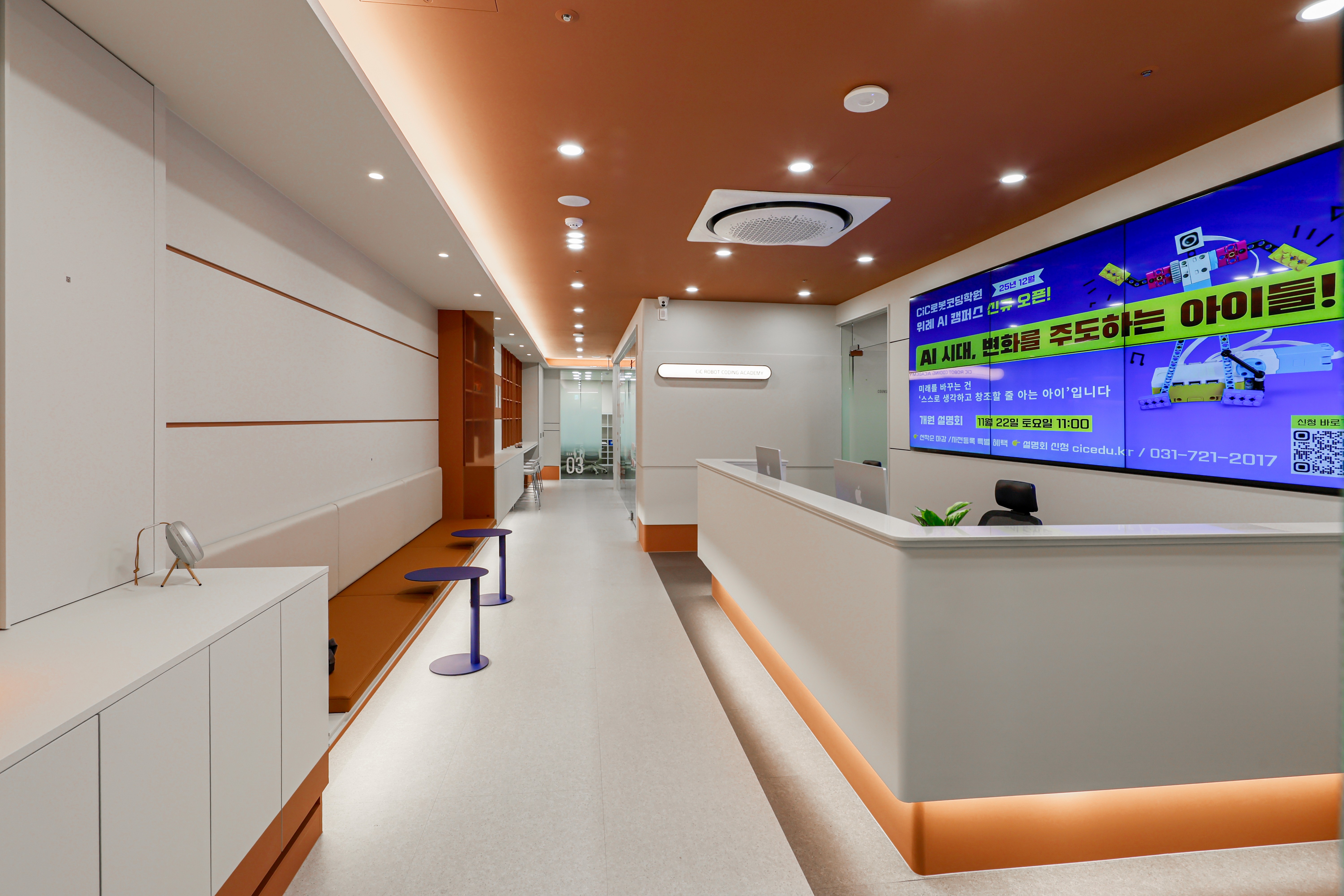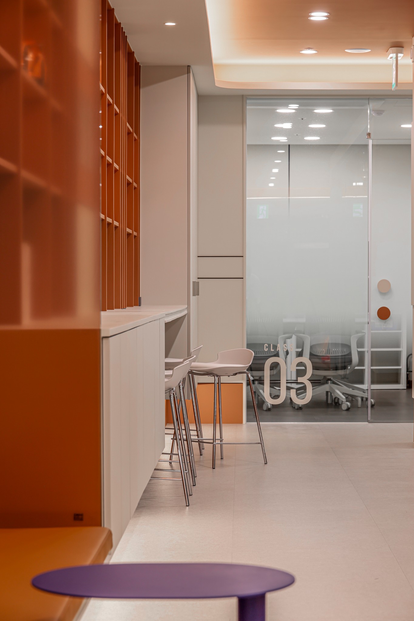 벽면을 따라 배치된 오렌지 벤치와 퍼플 포인트 테이블은 절묘한 조화로 긴장감 보다는 즐거움을 느낄 학원으로 만들어준다.