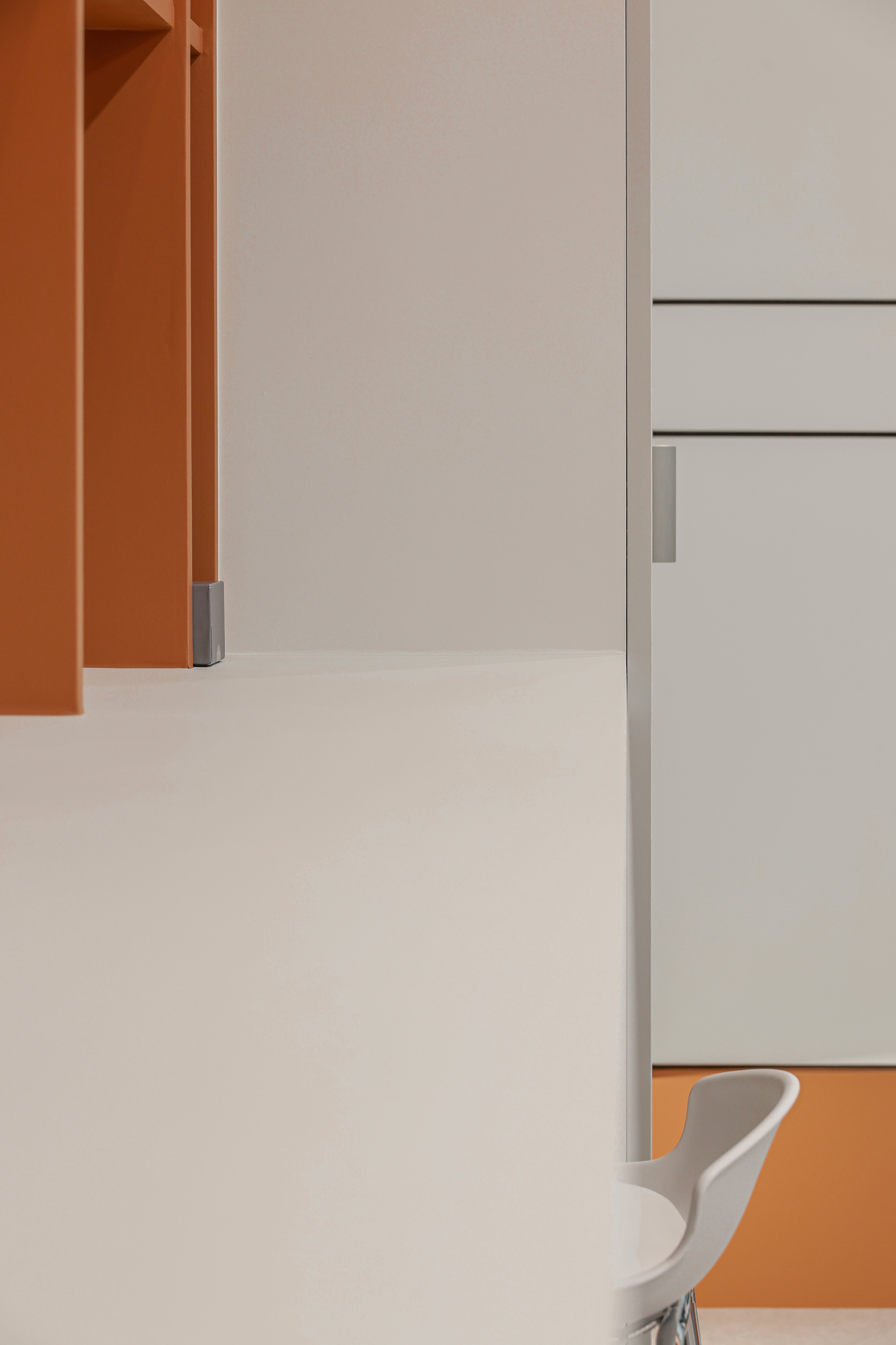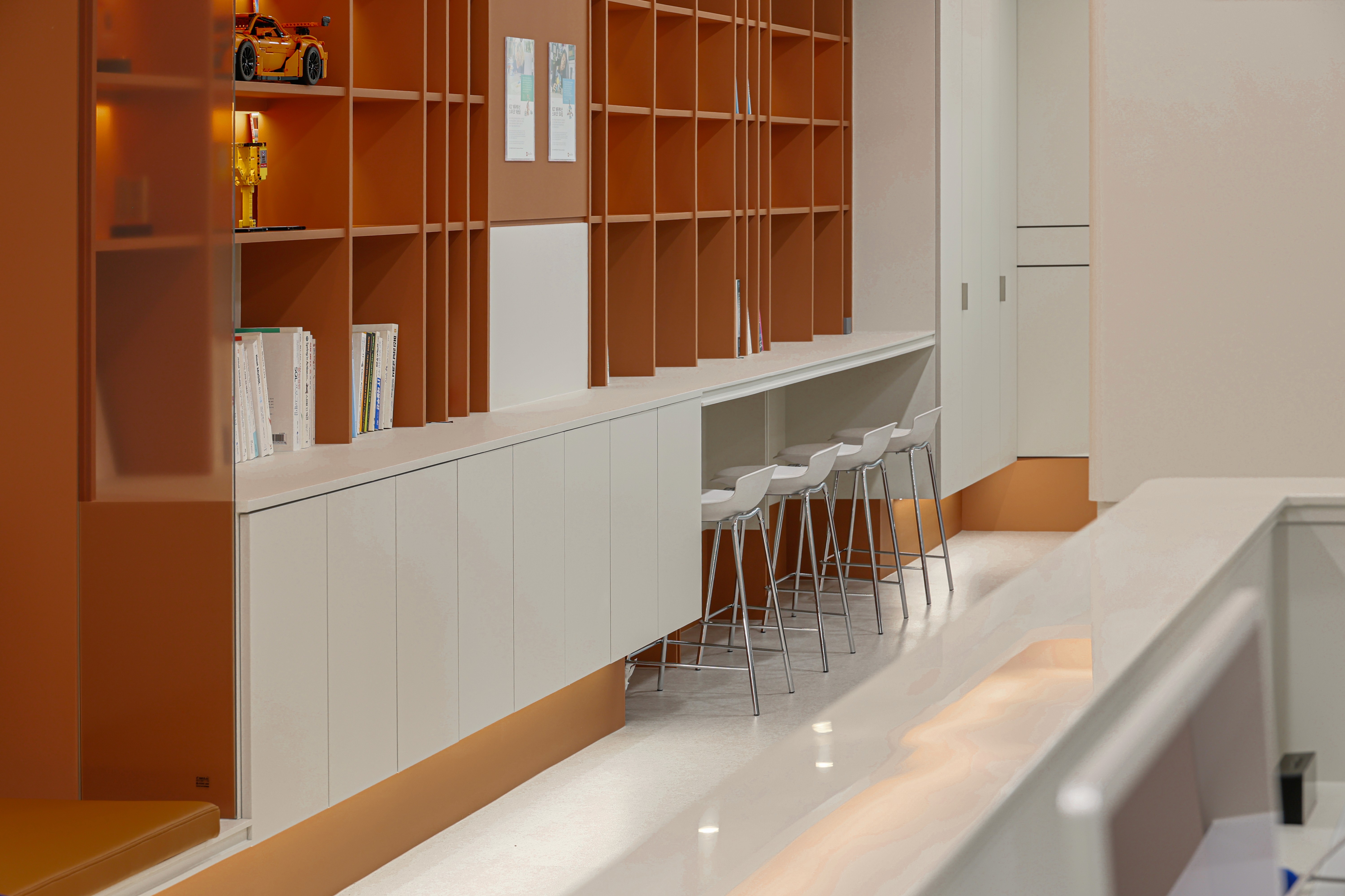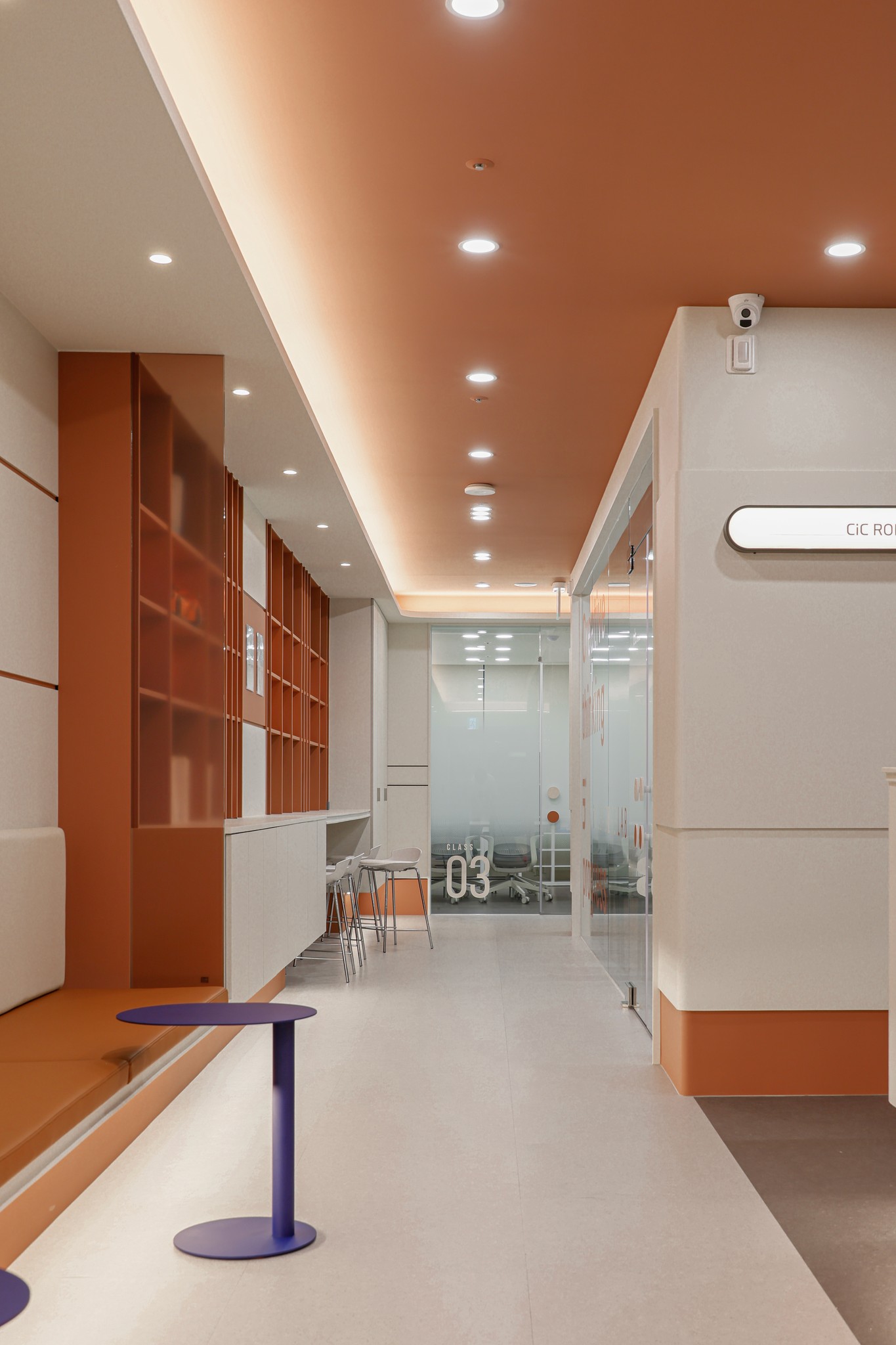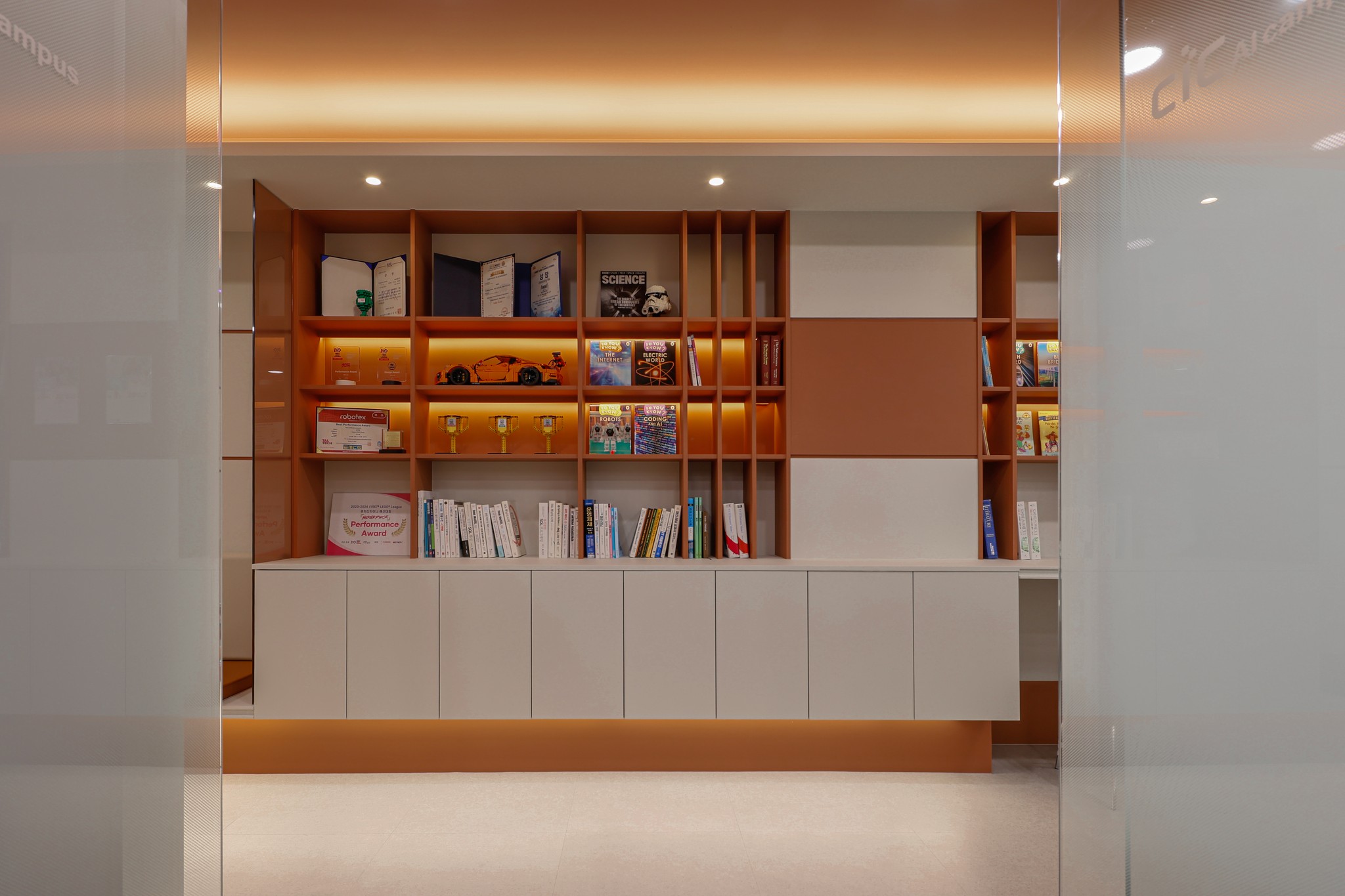 오렌지 컬러의 천장과 벽이 따뜻한 집중감을 형성하고, 정제된 화이트 선반이 질서감을 부여한다.