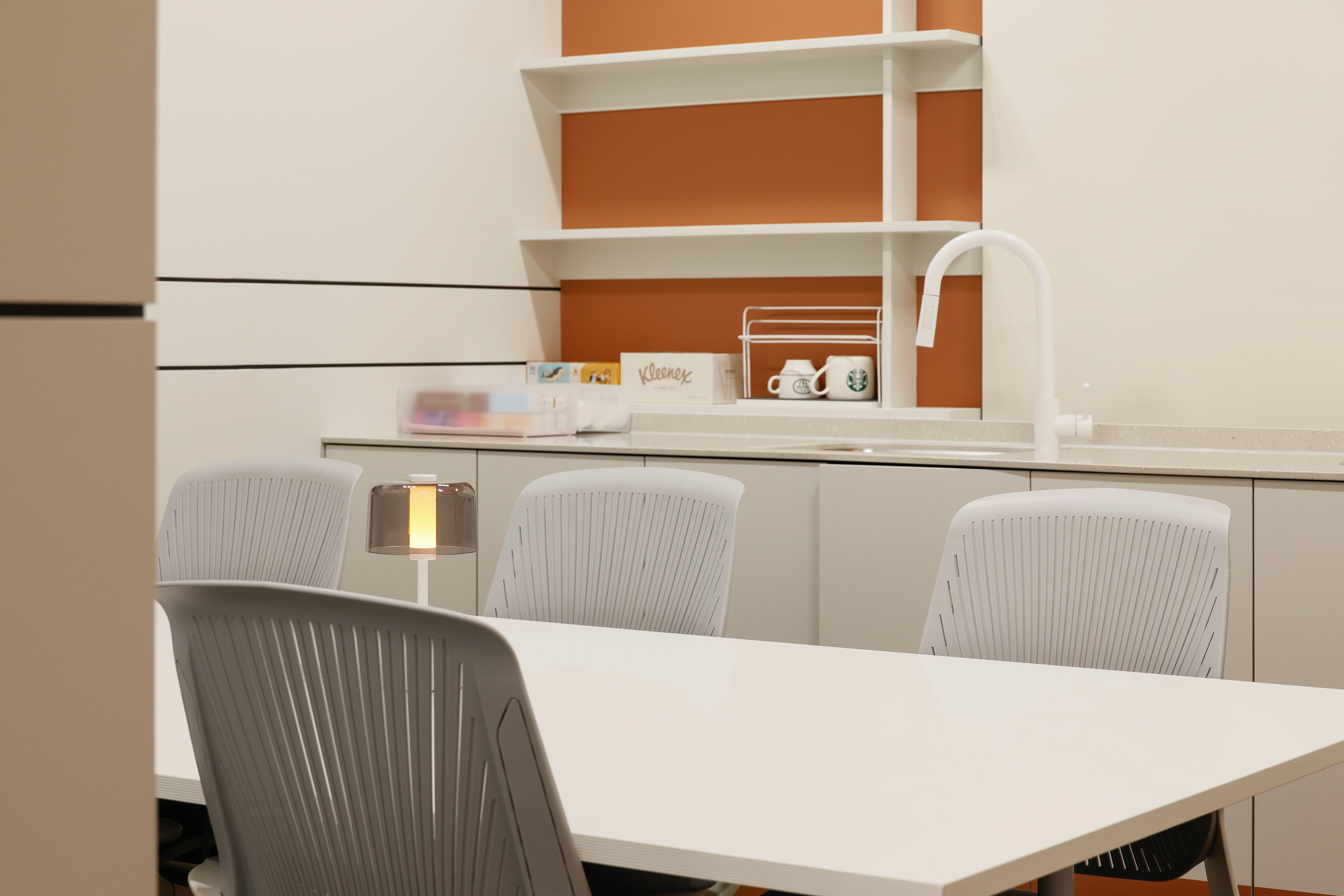 벽면은 이성적 공간에 감성의 여백을 더하고, 미세한 디테일까지 정돈된 분위기는 사고와 교감을 나눌 휴게실에 잘 어우러진다.