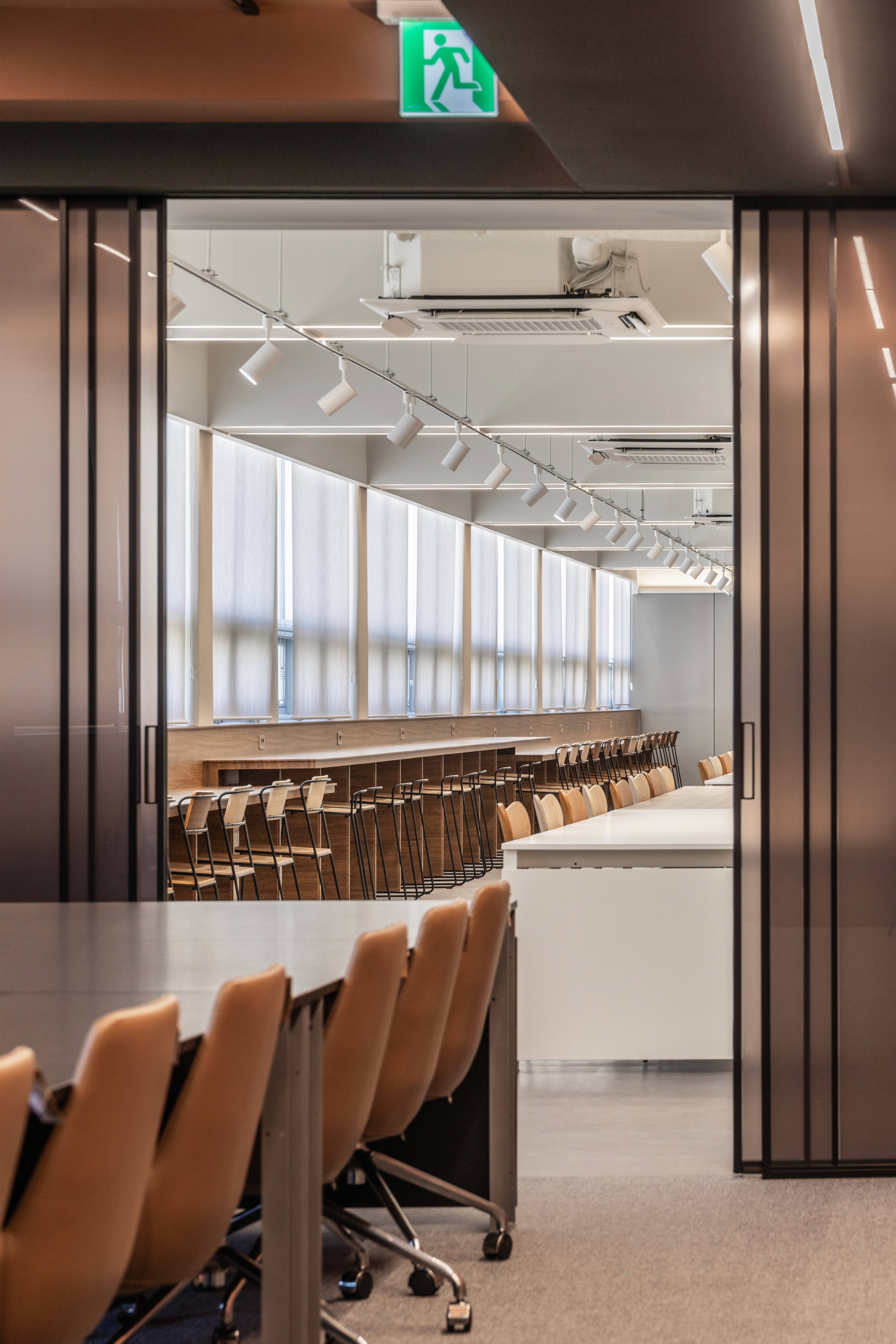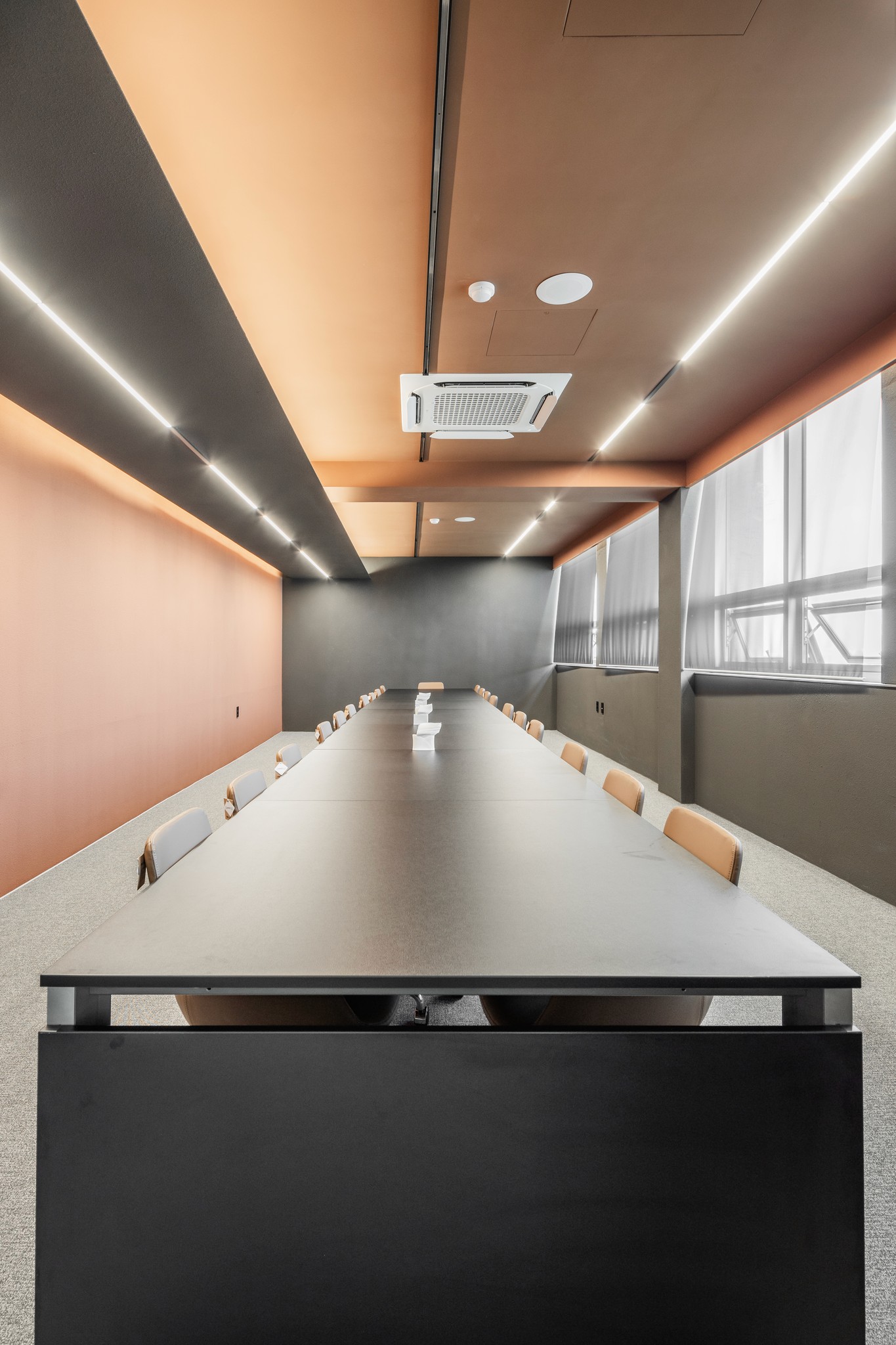 오픈된 천장 구조 위로는 정렬된 라인 조명과 트랙 조명이 리듬감 있게 조화를 이루며,공간의 경쾌한 분위기를 형성한다.