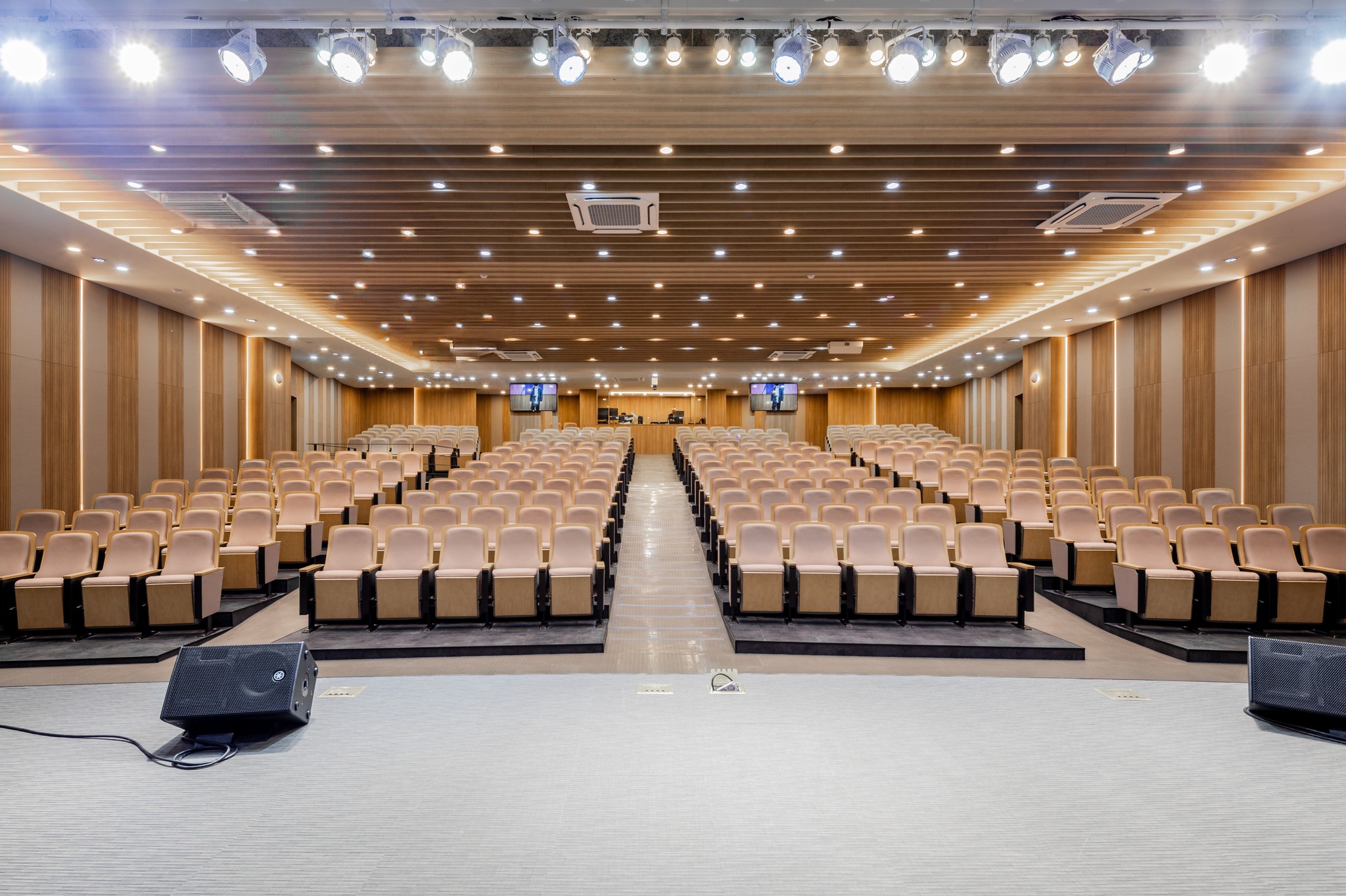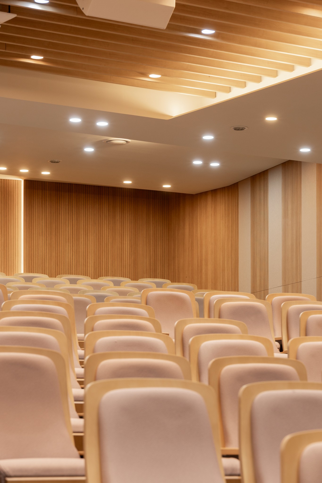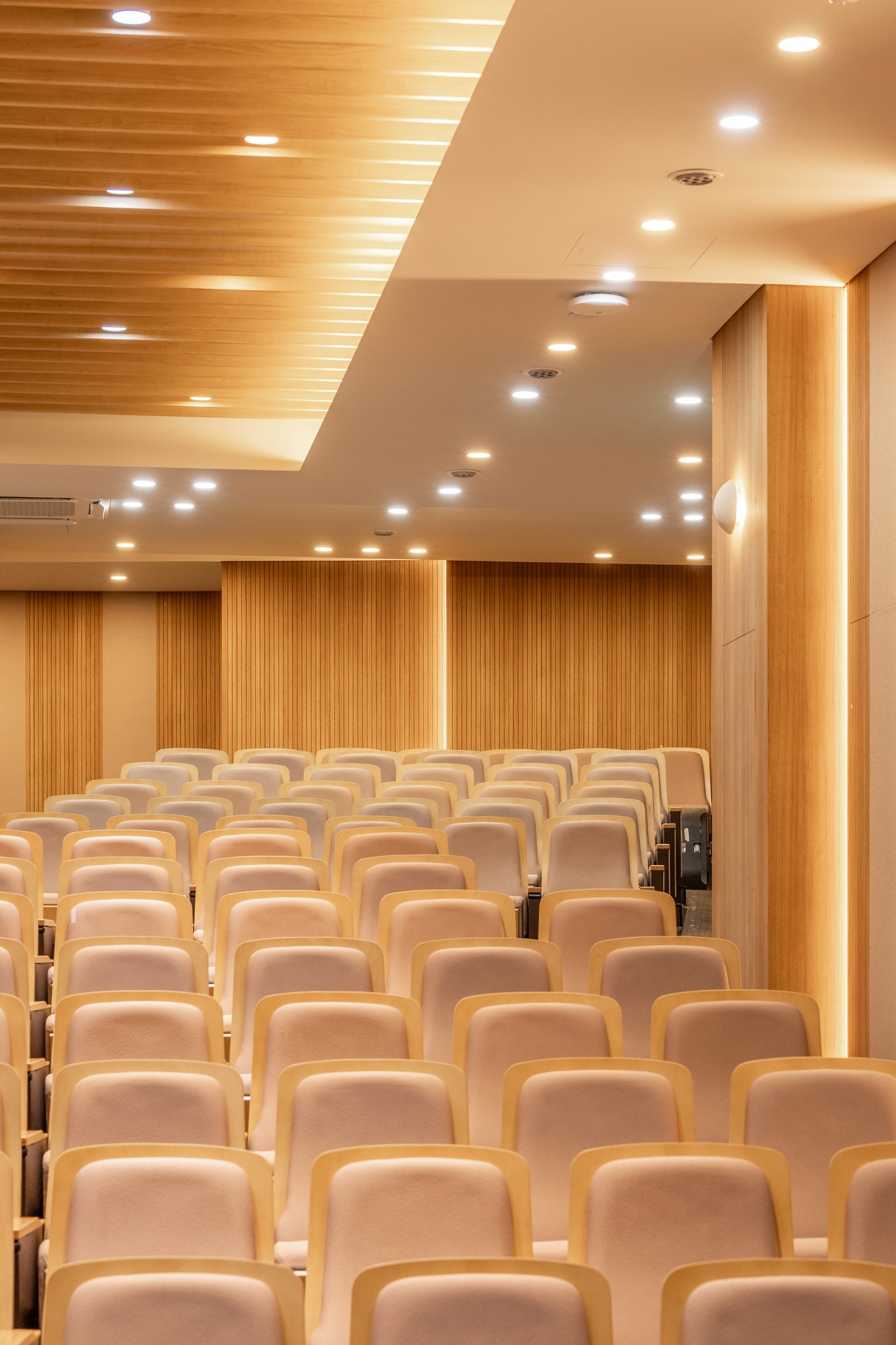 천장과 벽면에 적용된 수직 리듬의 우드 루버는 시각적 통일감을 주는 동시에,음향의 잔향을 부드럽게 정돈한다.