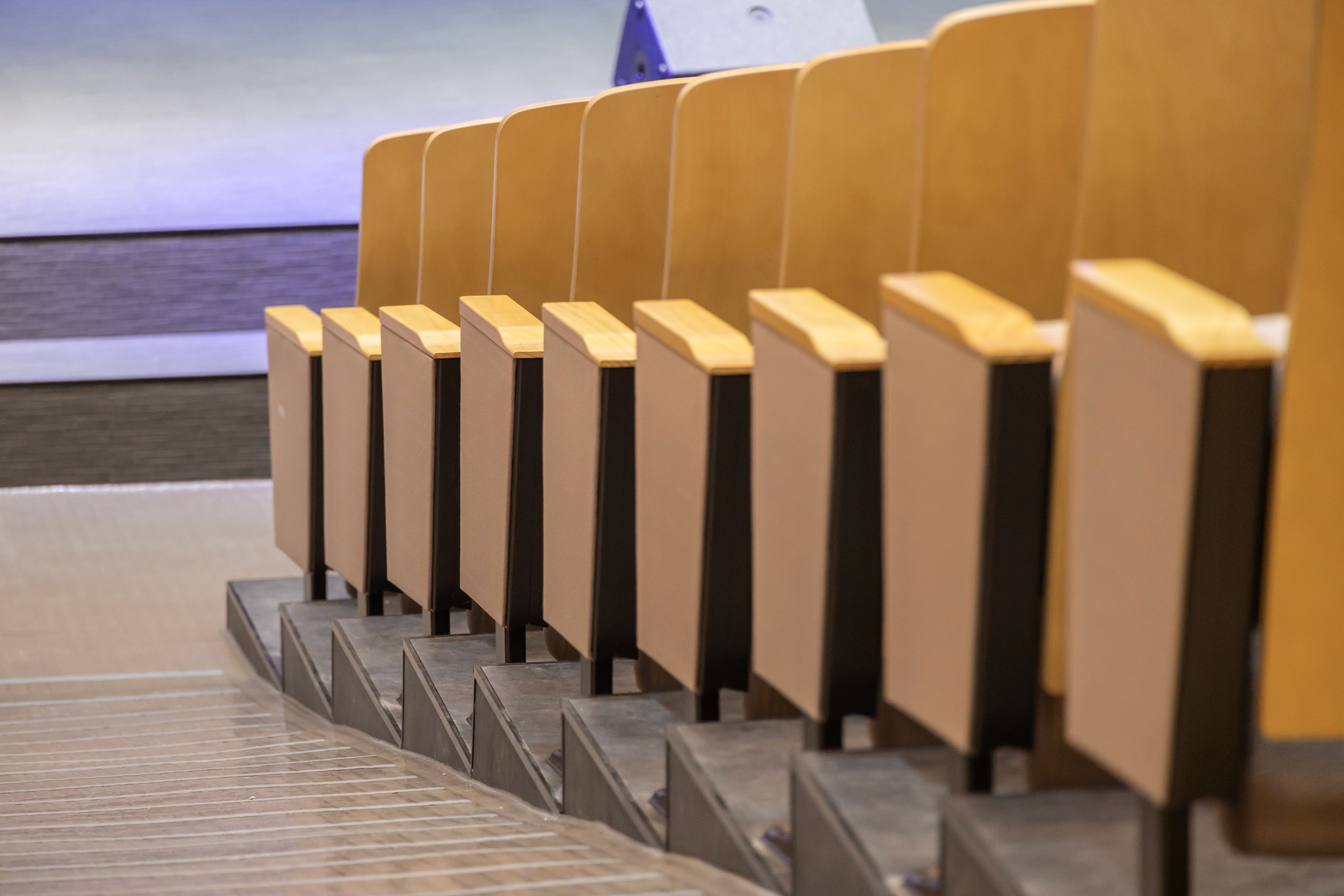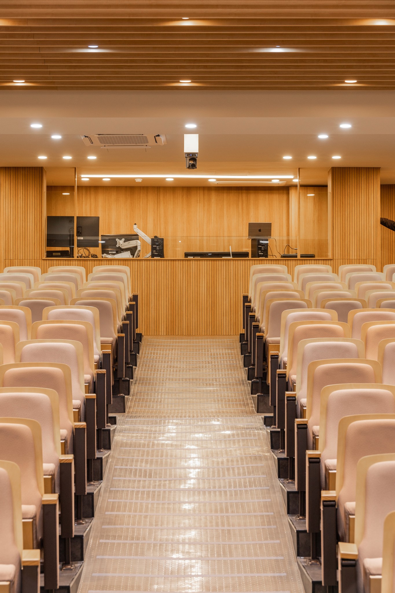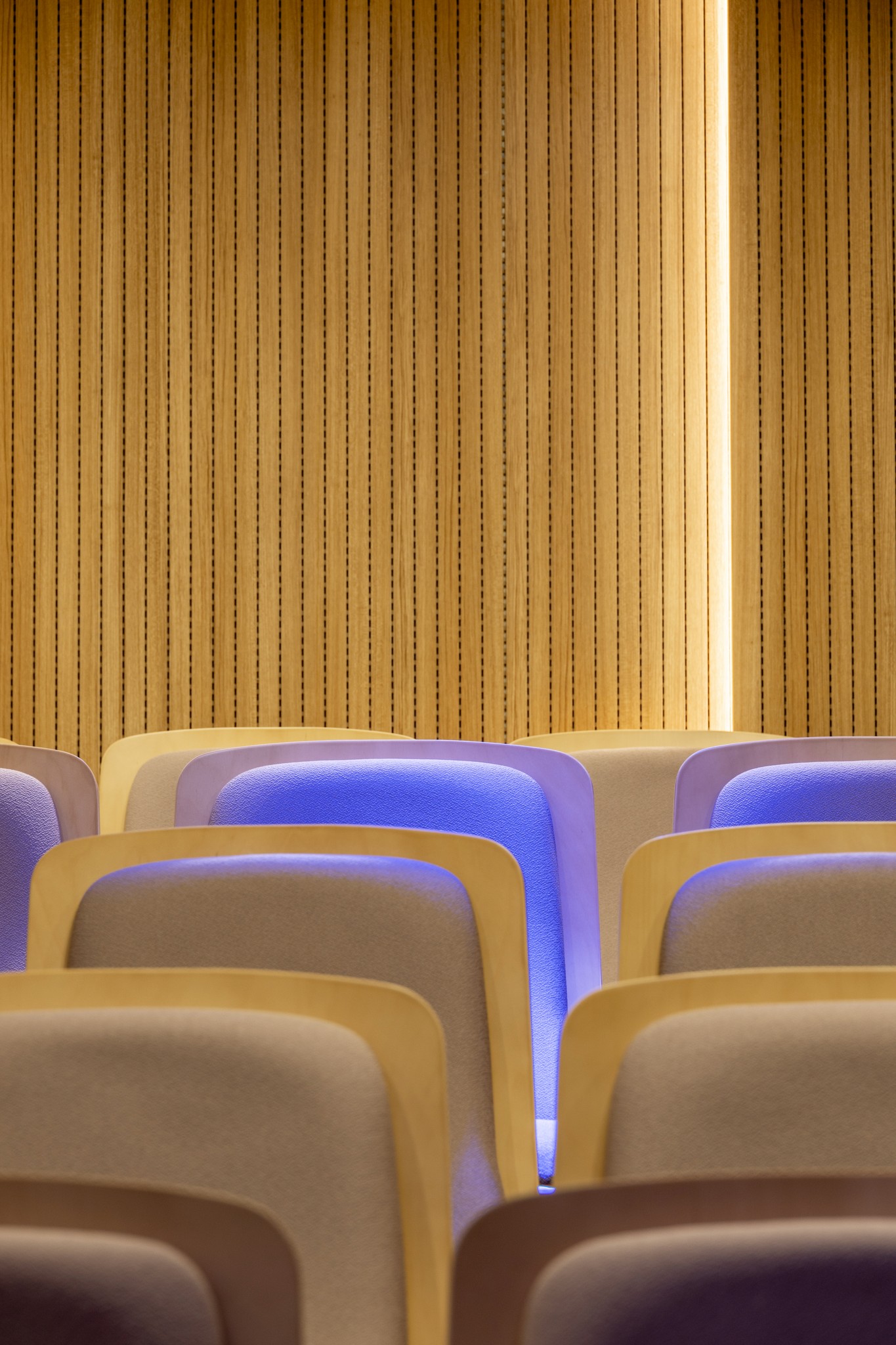 천장과 벽면에 적용된 수직 리듬의 우드 루버는 시각적 통일감을 주는 동시에,음향의 잔향을 부드럽게 정돈한다.