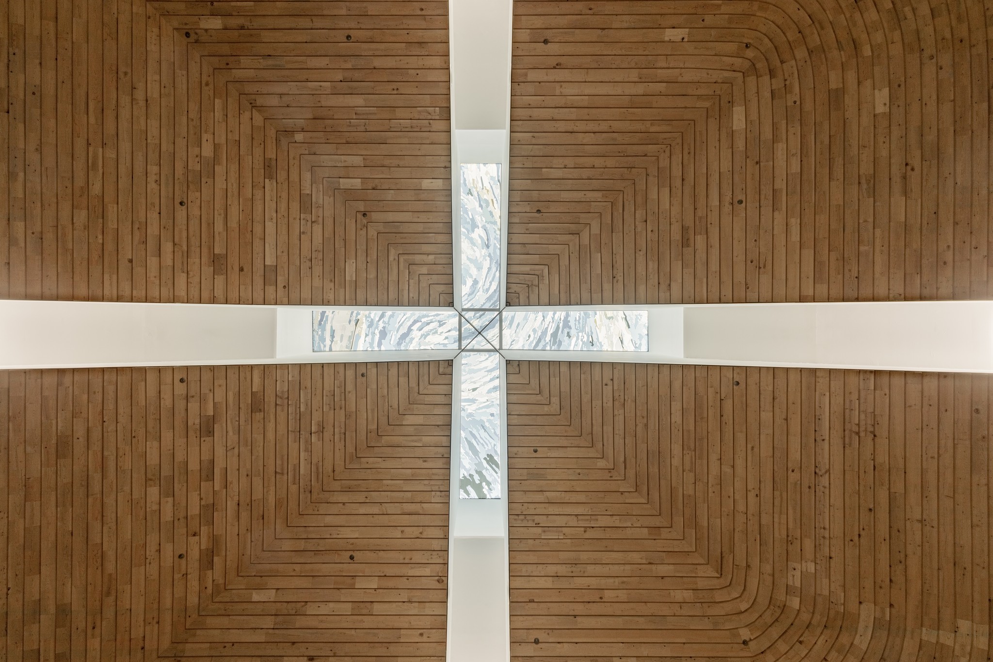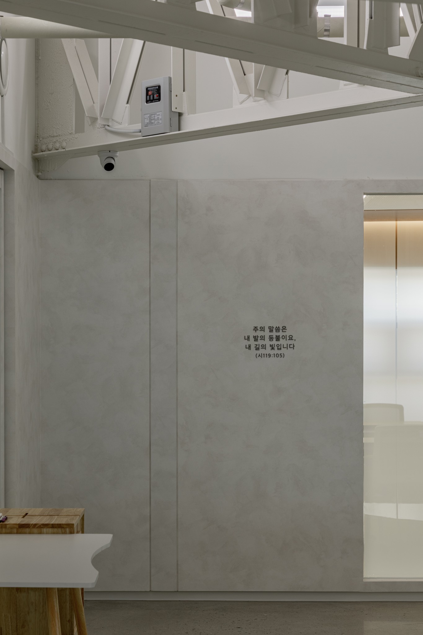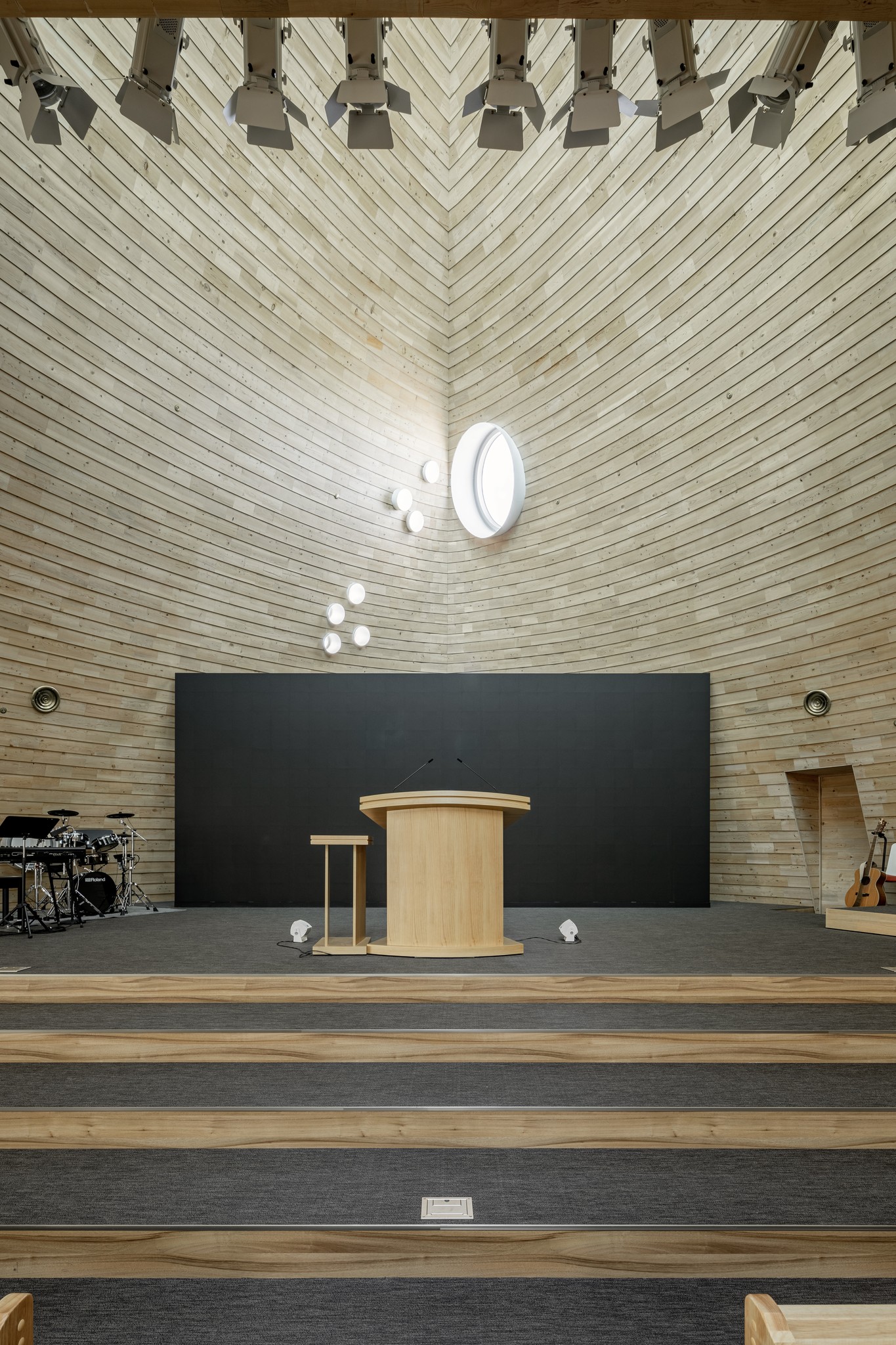 천장을 가로지르는 십자가 형태의 조명과 벽면의 둥근 창들은 빛을 통해 신성한 분위기를 고조시키며, 나무의 질감이 주는 편안함 속에서 집중과 사색을 돕는다.