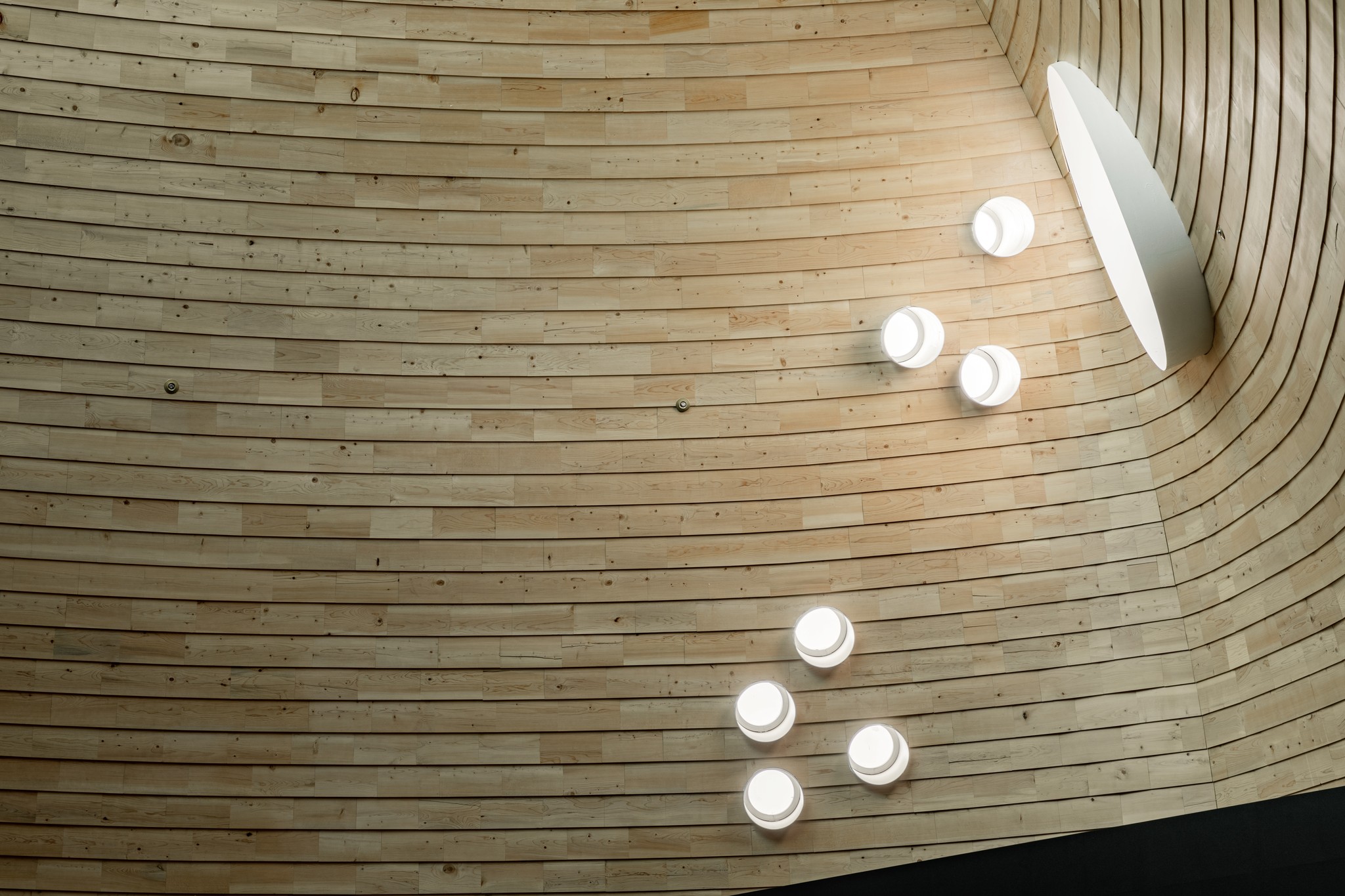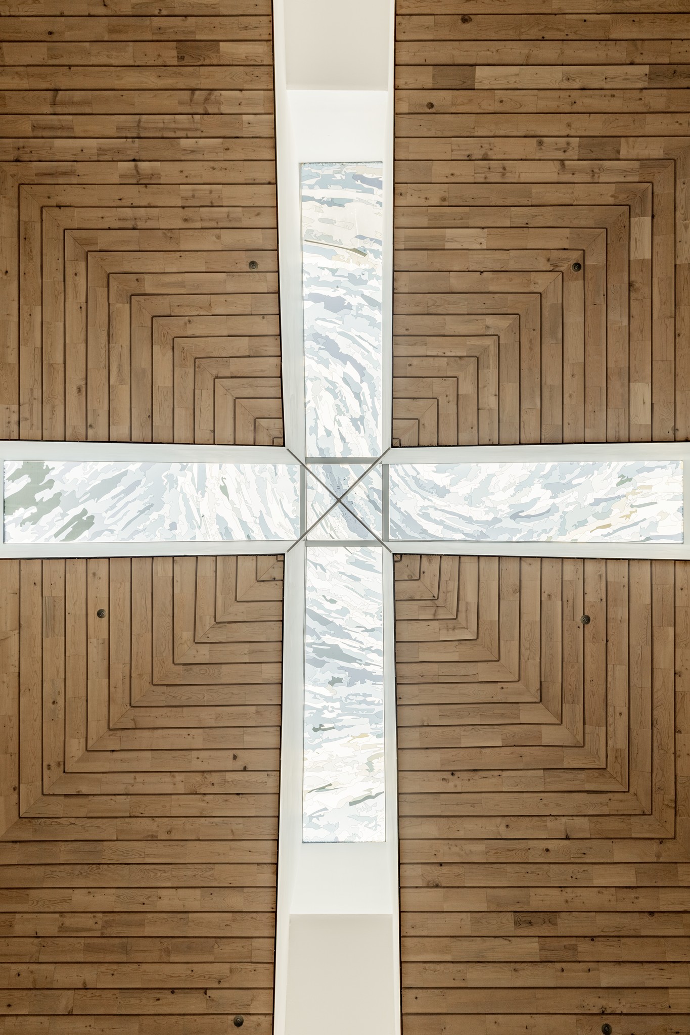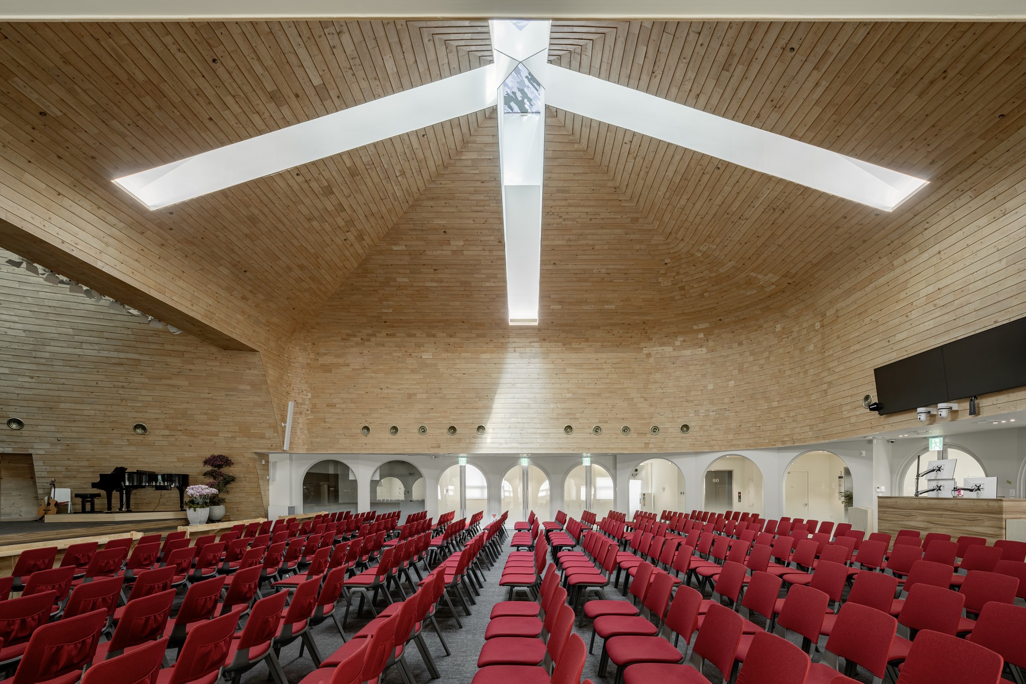 천장을 가로지르는 십자가 형태의 조명과 벽면의 둥근 창들은 빛을 통해 신성한 분위기를 고조시키며, 나무의 질감이 주는 편안함 속에서 집중과 사색을 돕는다.