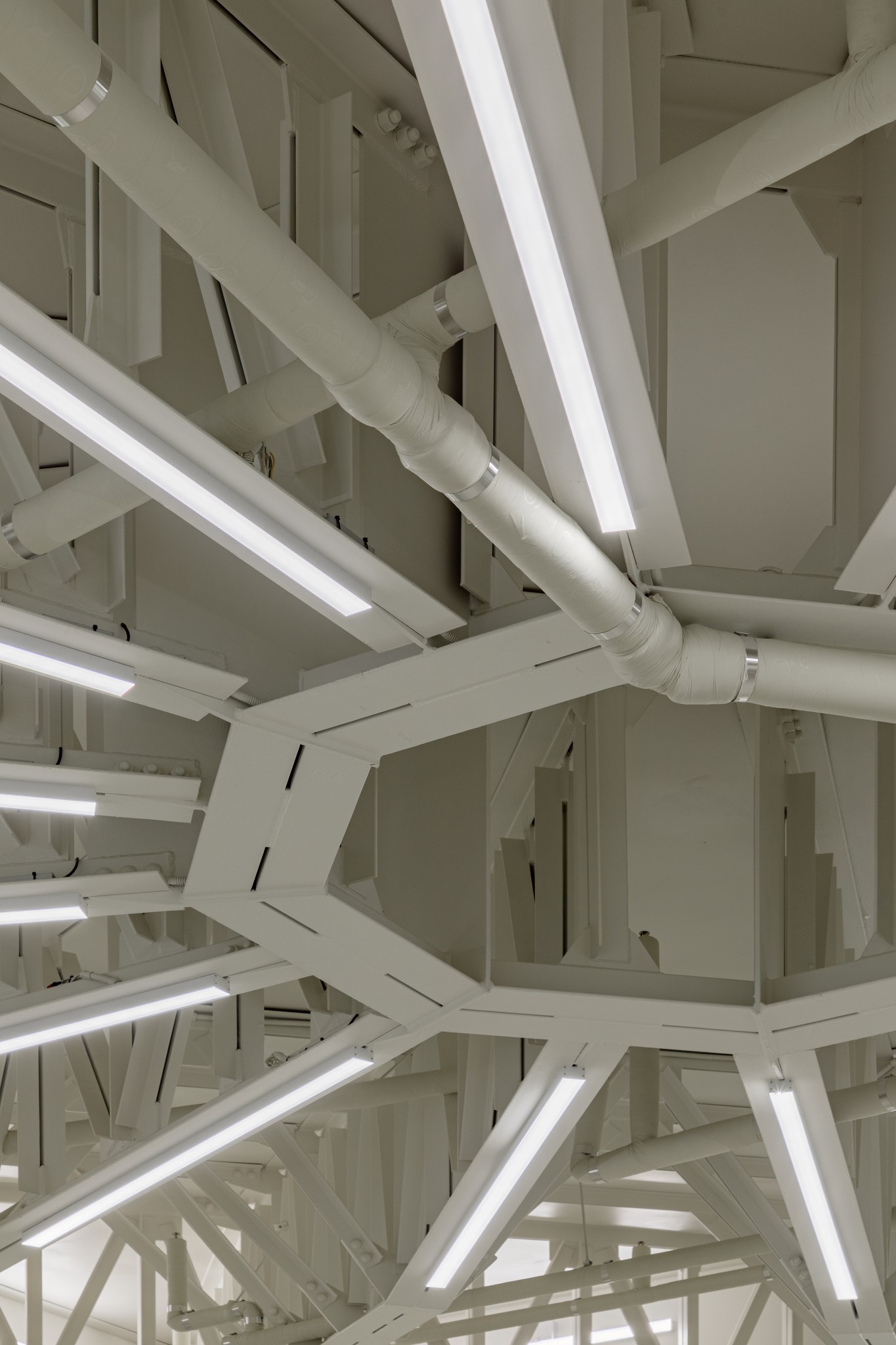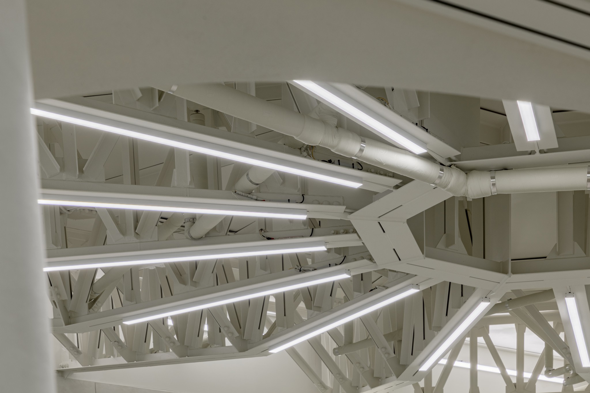 특히, 햇살처럼 쏟아지는 천장의 거대한 방사형 조명 구조물은 공간 전체를 환하게 밝히며 경외감을 자아낸다.