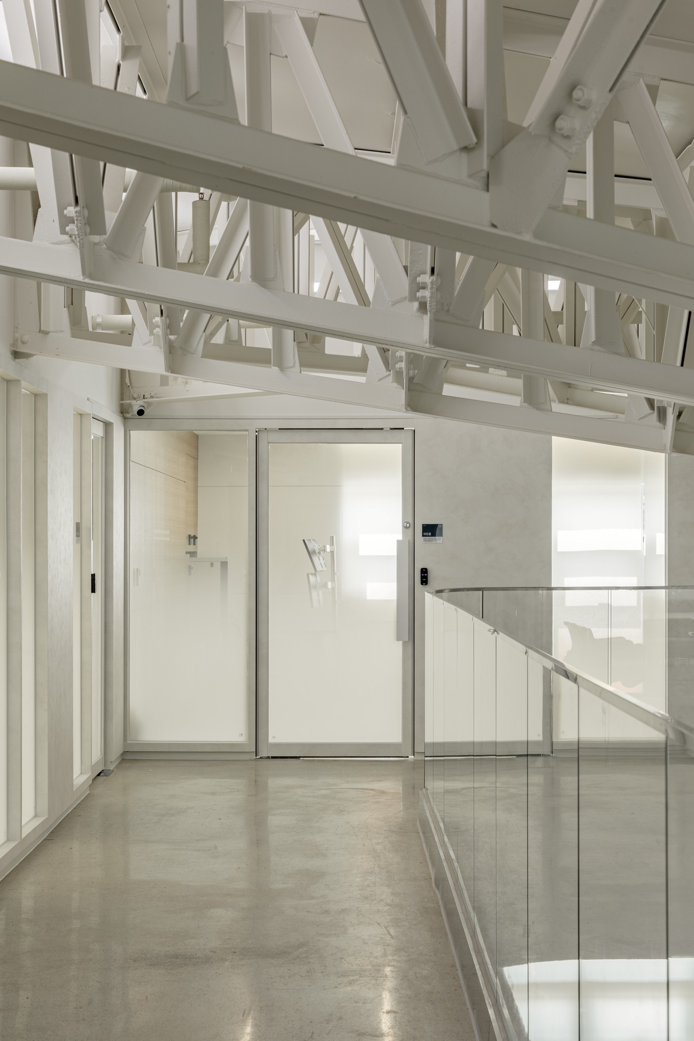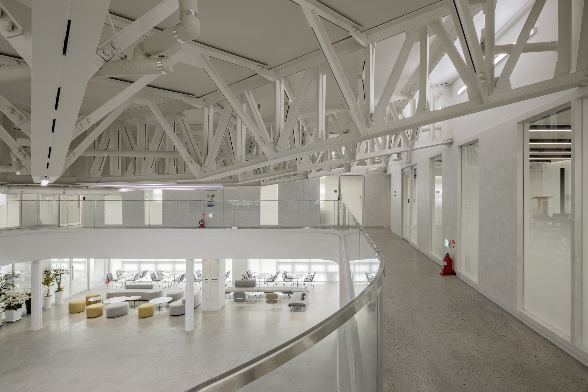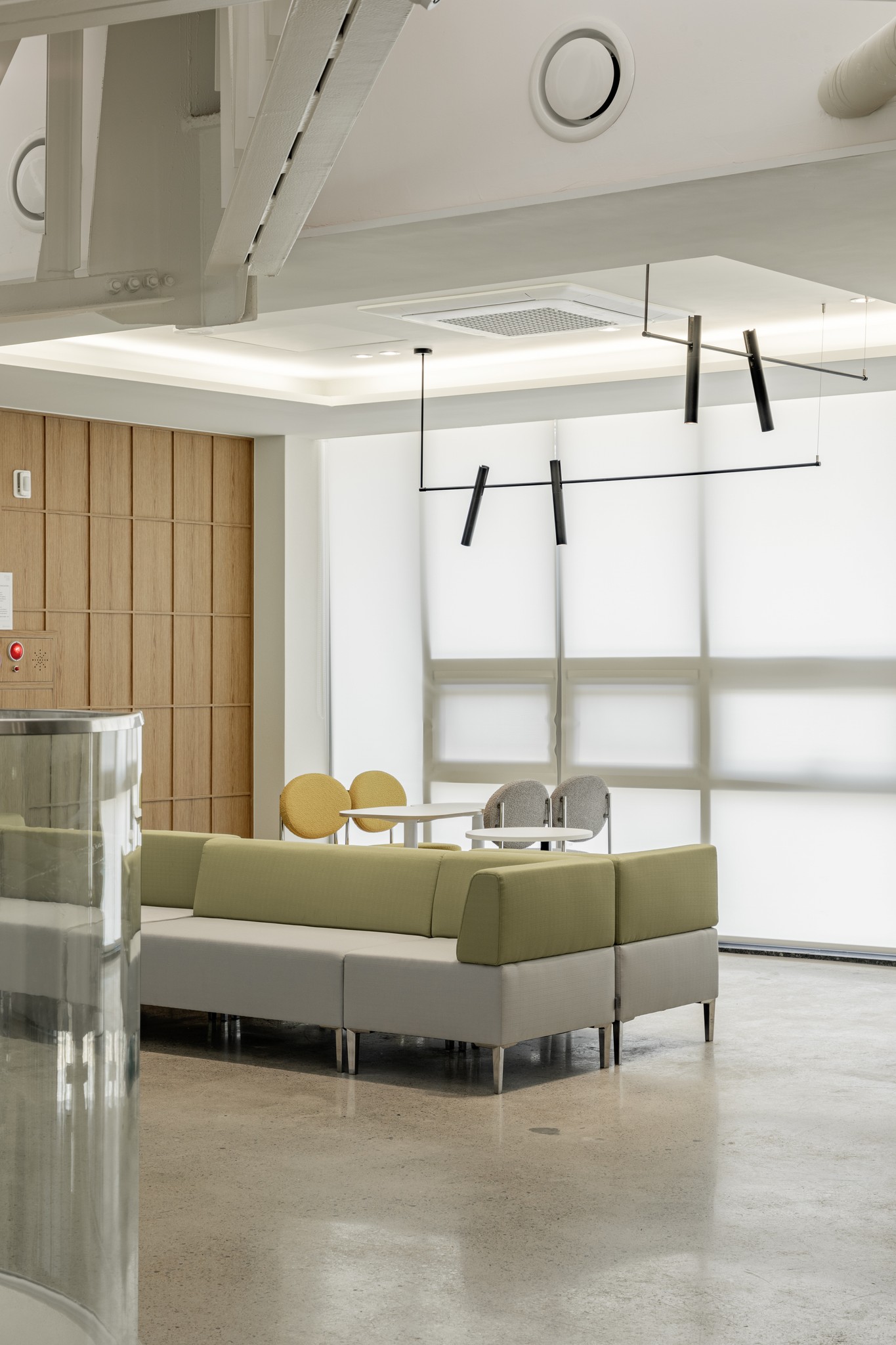 1층의 넓은 로비 공간은 밝은 화이트 톤과 은은한 베이지 컬러, 그리고 깔끔한 콘크리트 마감으로 미니멀하면서도 따뜻한 인상을 준다.