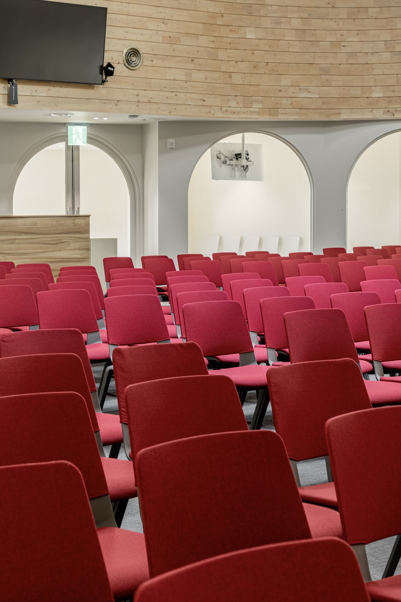 붉은색 의자들이 질서정연하게 놓여 있는 이곳은, 따뜻한 우드 패널로 마감된 아치형 천장과 벽면이 경건하면서도 포근한 분위기를 연출한다.