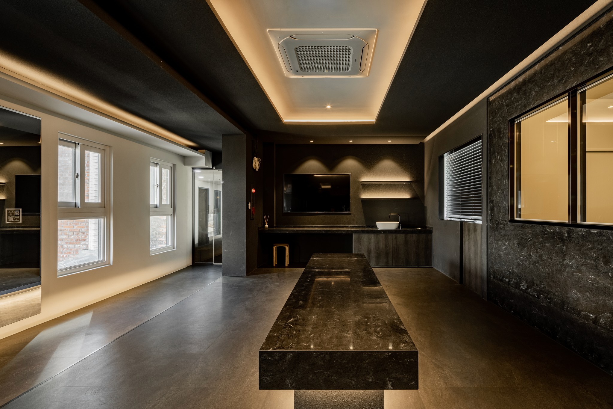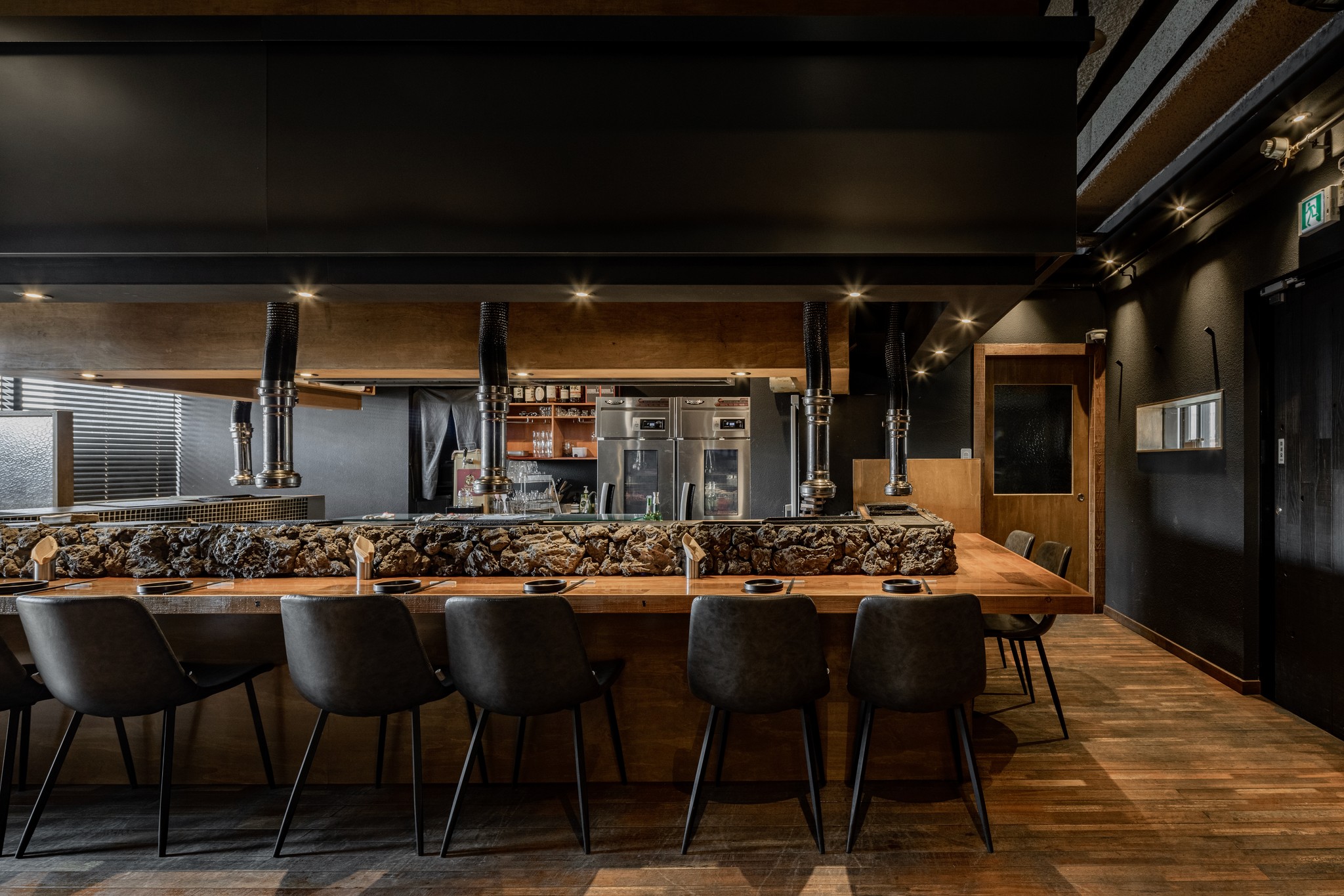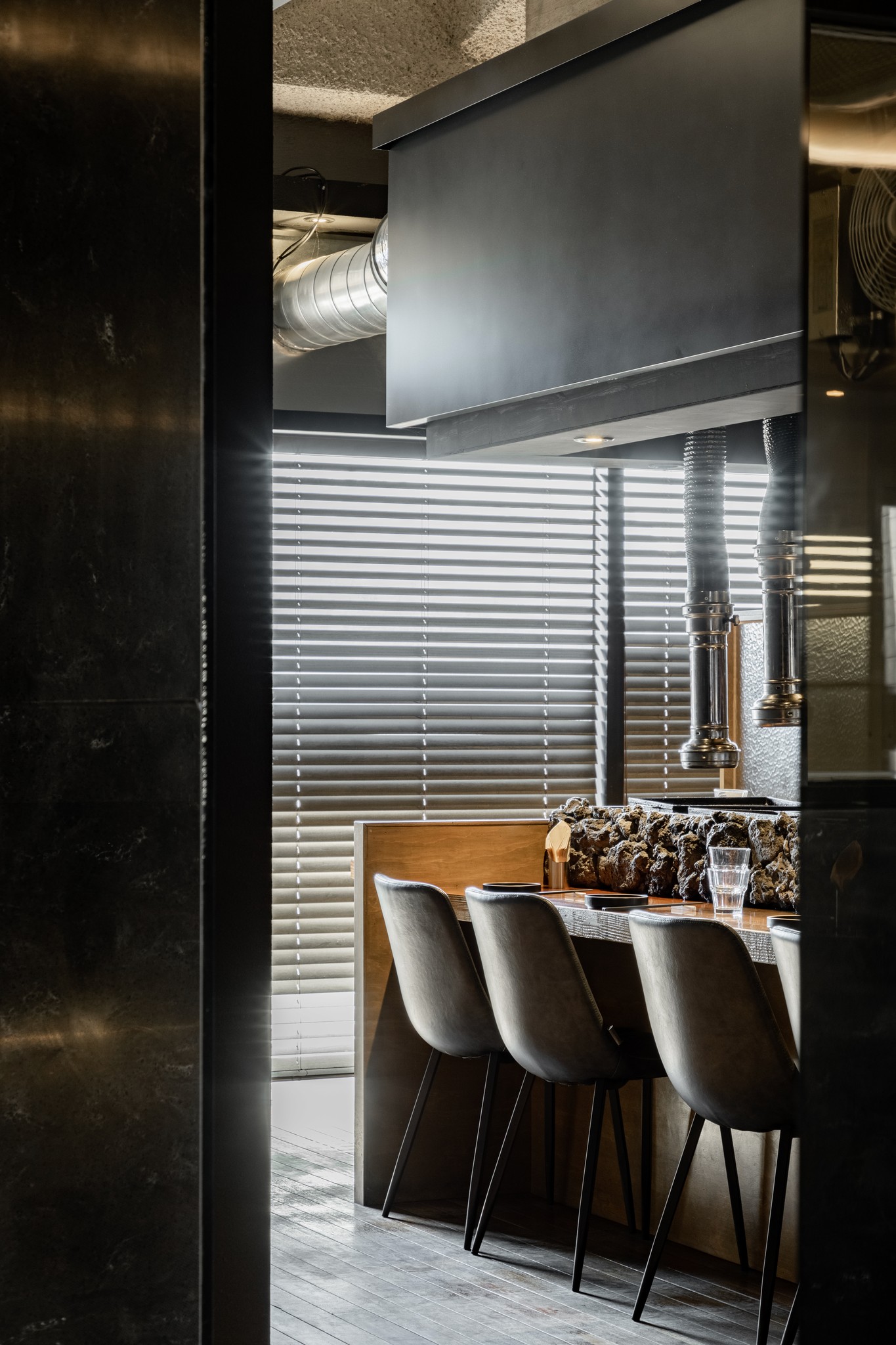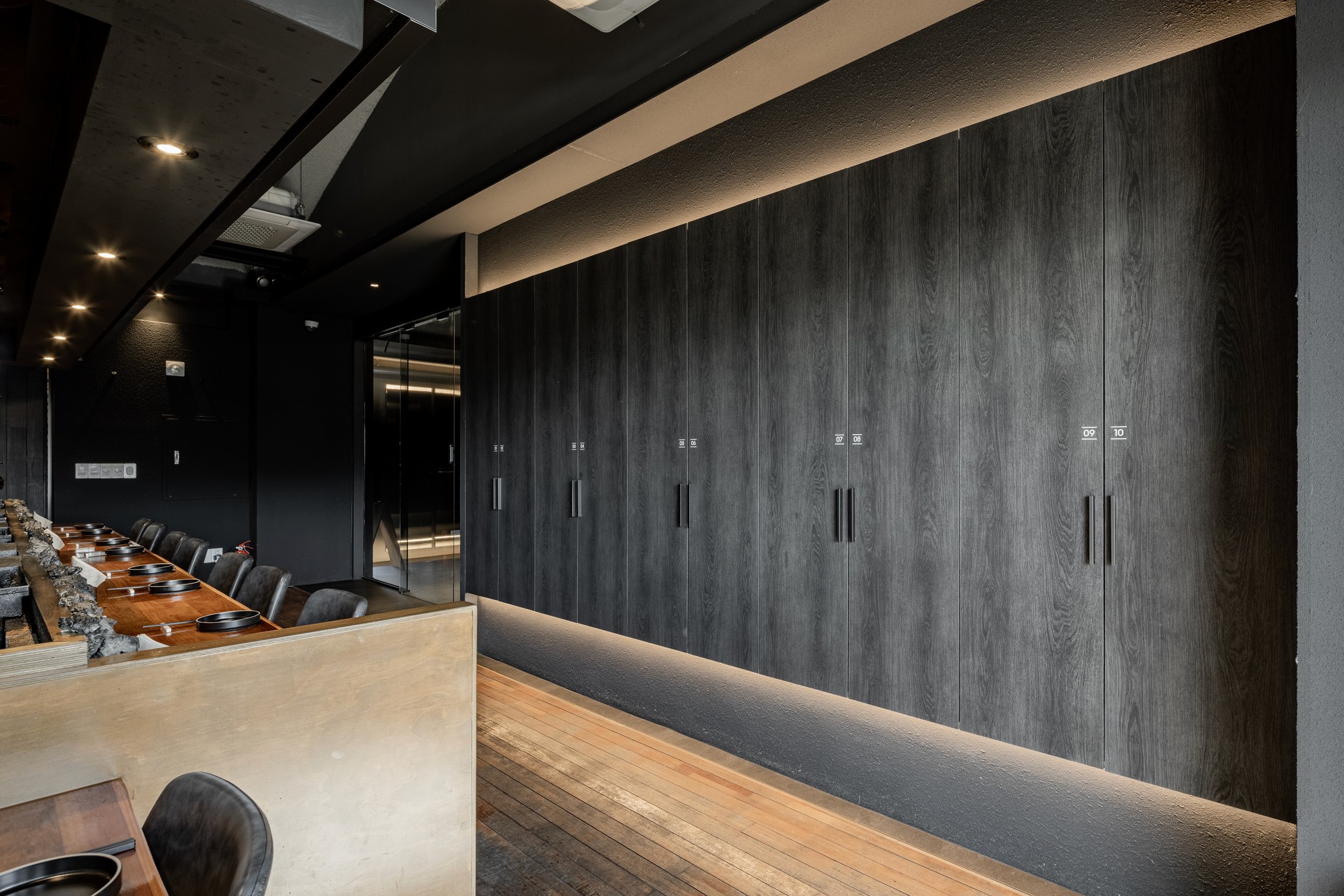 블랙과 짙은 그레이 컬러가 주를 이루는 공간은 거친 질감의 벽면과 매끄럽게 마감된 바닥, 그리고 은은하게 빛을 발하는 조명이 조화를 이루며 풍부한 텍스처와 깊이를 더한다. 특히, 천장과 바닥을 따라 흐르는 간접 조명은 공간을 부드럽게 감싸 안으며, 미식에 집중할 수 있는 아늑한 무드를 조성한다.