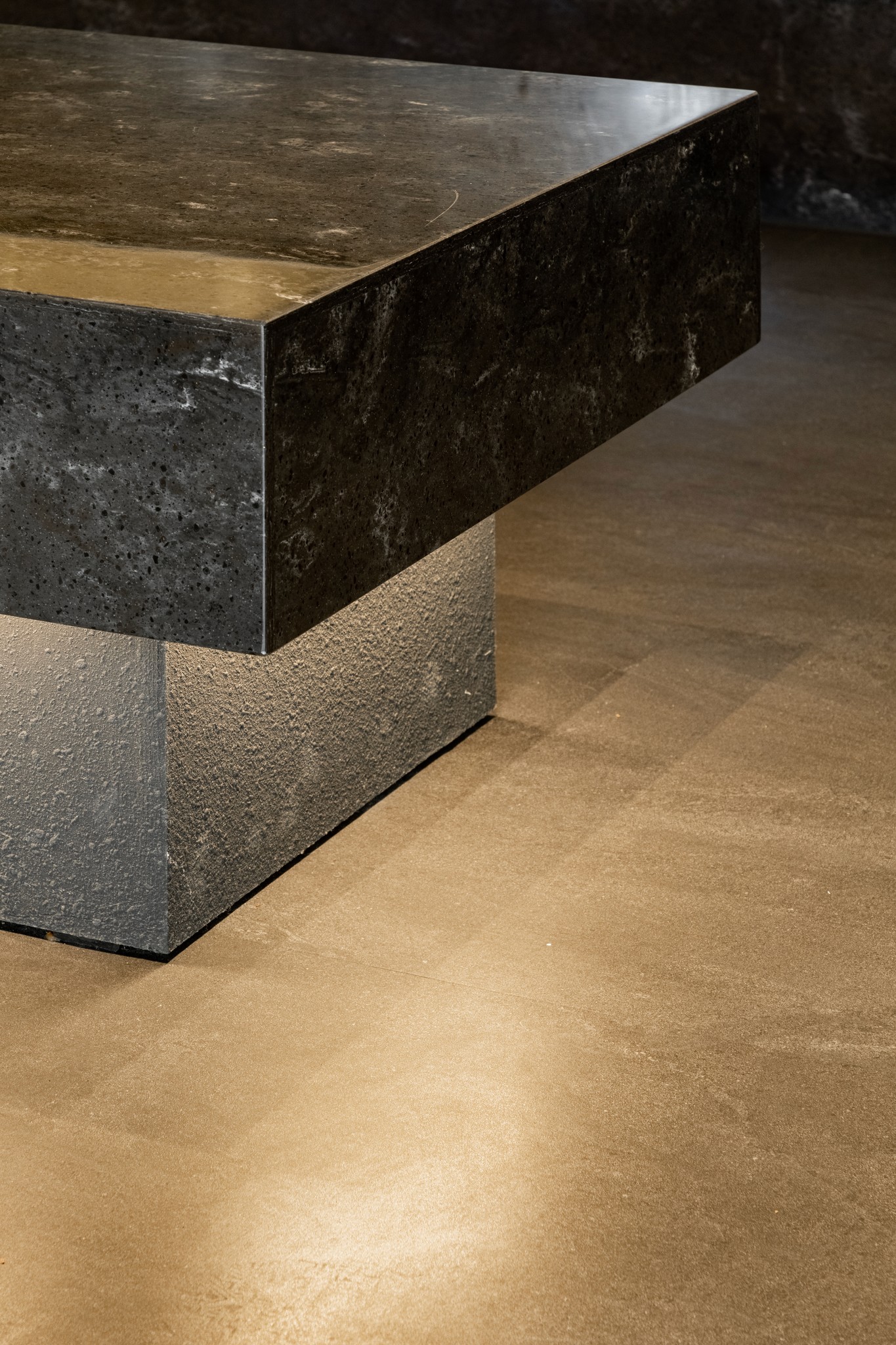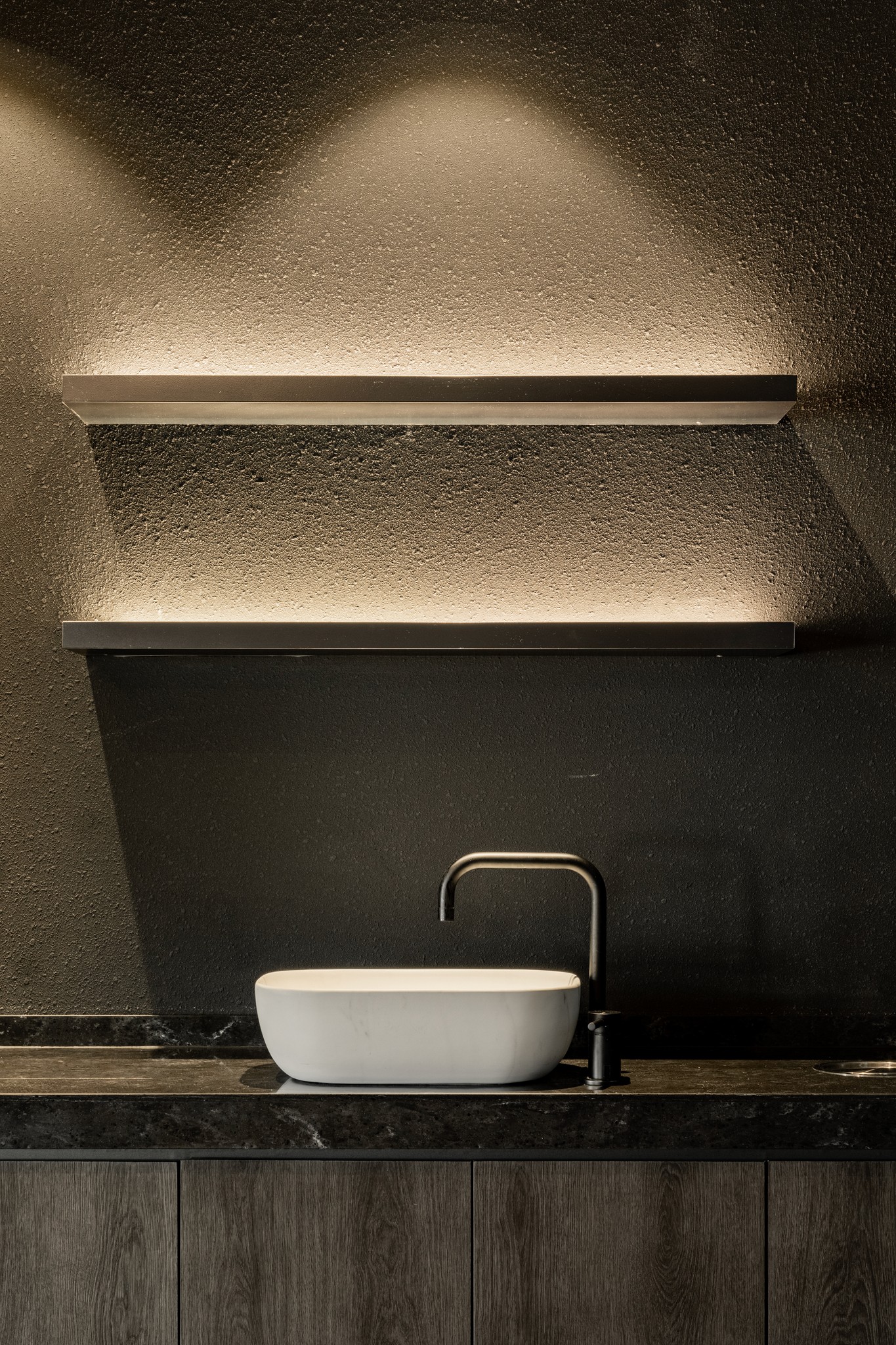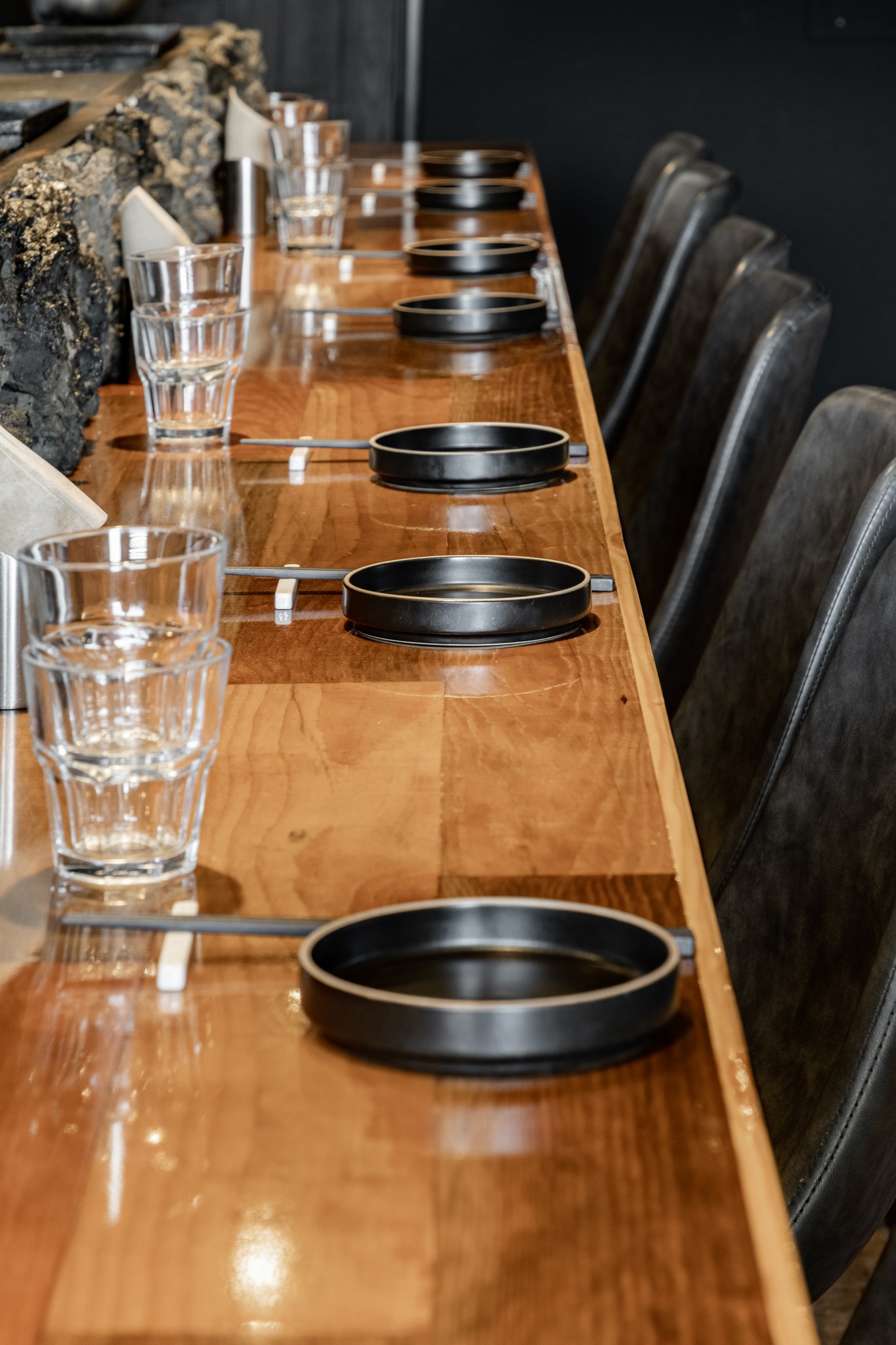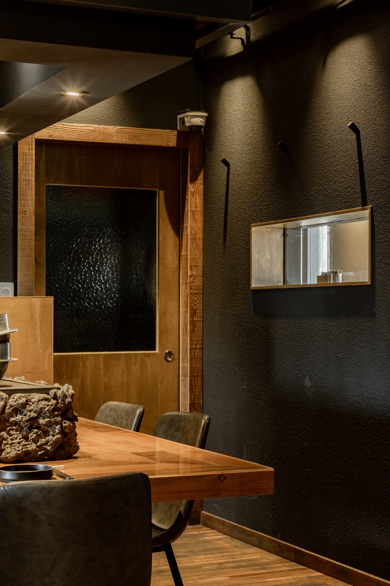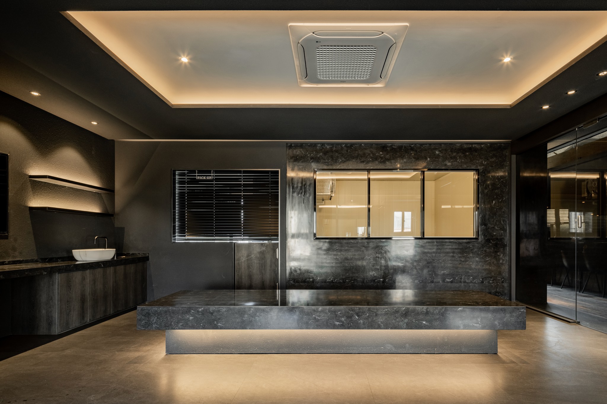 블랙과 짙은 그레이 컬러가 주를 이루는 공간은 거친 질감의 벽면과 매끄럽게 마감된 바닥, 그리고 은은하게 빛을 발하는 조명이 조화를 이루며 풍부한 텍스처와 깊이를 더한다. 특히, 천장과 바닥을 따라 흐르는 간접 조명은 공간을 부드럽게 감싸 안으며, 미식에 집중할 수 있는 아늑한 무드를 조성한다.