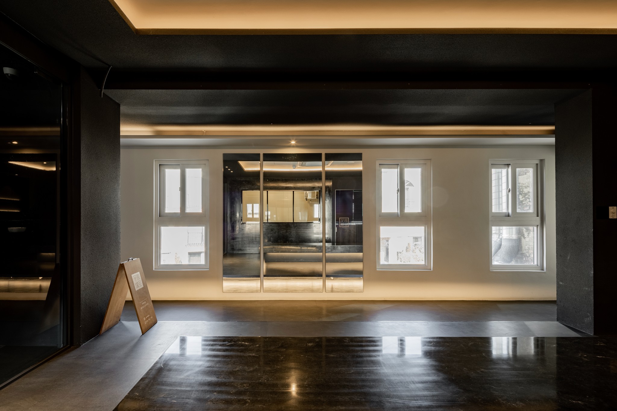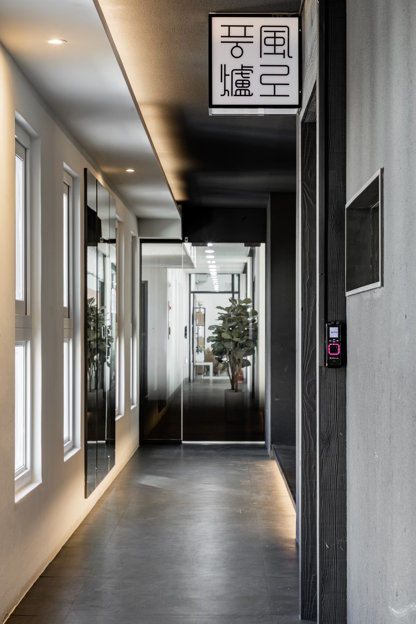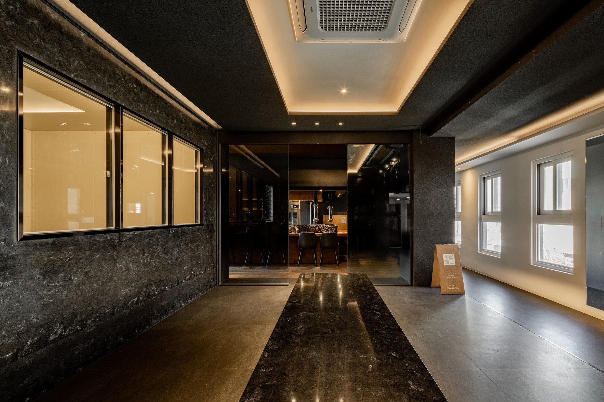 두 번째는 입구에서 마주하는 인상적인 대기 공간이다. 어두운 돌로 만들어진 듯한 긴 벤치는 마치 공중에 떠 있는 것처럼 연출되어 경외감을 자아낸다. 이 공간은 방문객들이 미식의 여정을 시작하기 전, 잠시 숨을 고르며 기대감을 키울 수 있는 프롤로그와 같다. 복도를 따라 이어진 어두운 톤의 벽면과 깔끔한 조명, 그리고 감각적인 로고 사인은 공간 전체의 통일된 아이덴티티를 보여준다.
