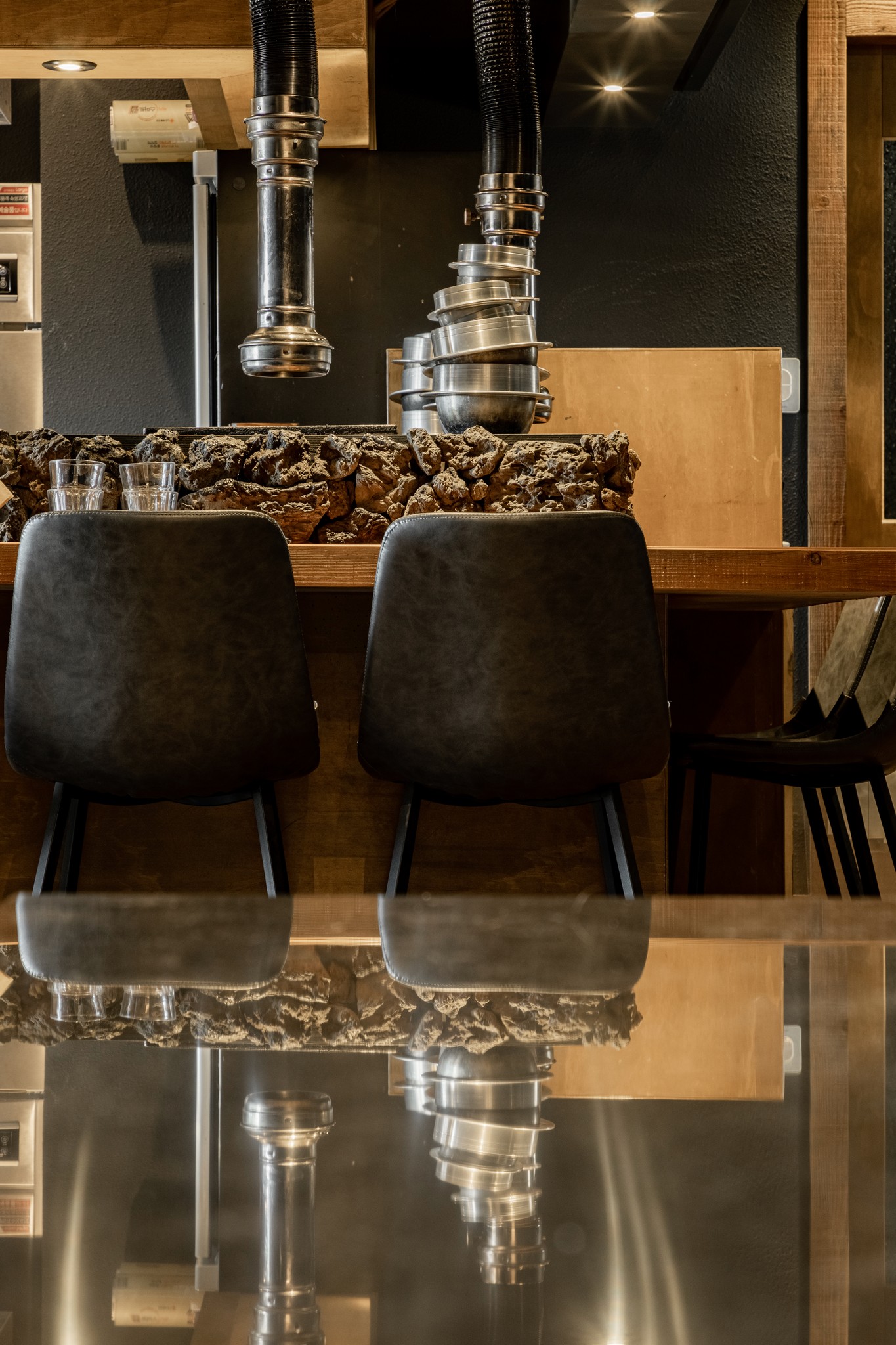풍로 본점은 미식의 경험을 위한 두 가지 다른 형태의 좌석을 제안한다. 첫 번째는 셰프의 손길을 가장 가까이에서 느낄 수 있는 바 카운터다. 길게 뻗은 바 테이블은 셰프가 직접 고기를 구워주는 풍경을 눈앞에서 감상할 수 있게 한다. 테이블 중앙에 놓인 거친 질감의 화산석은 '불'과 '자연'이라는 풍로의 철학을 시각적으로 구현하는 중요한 오브제다.