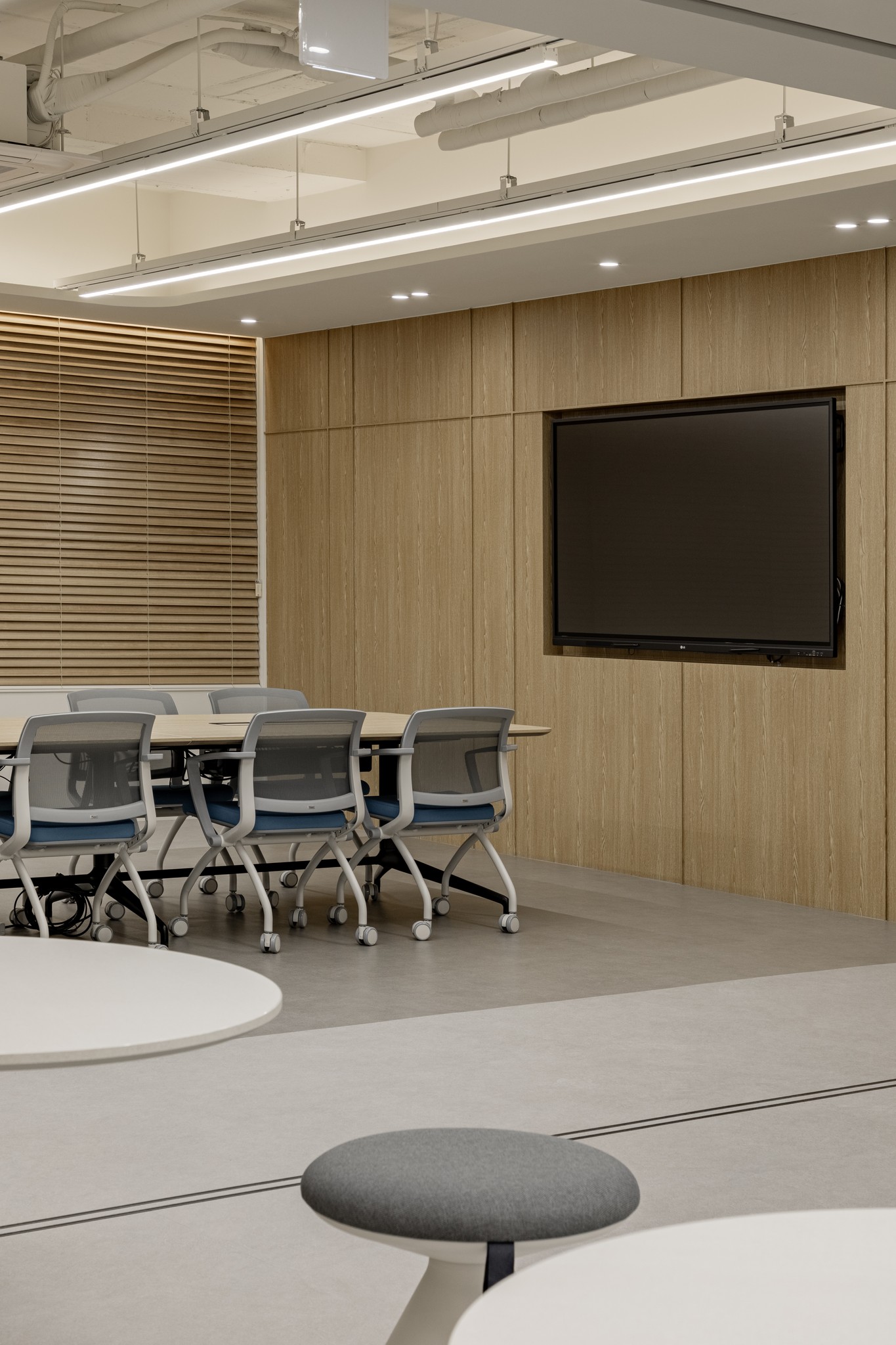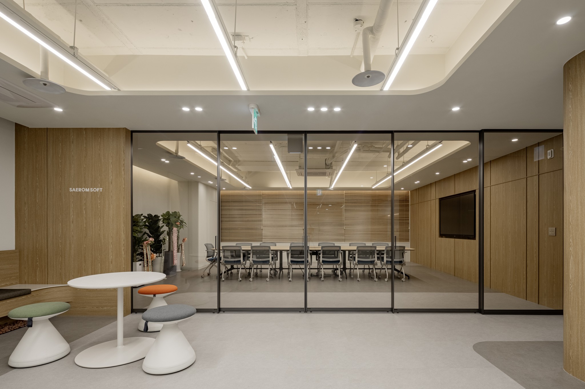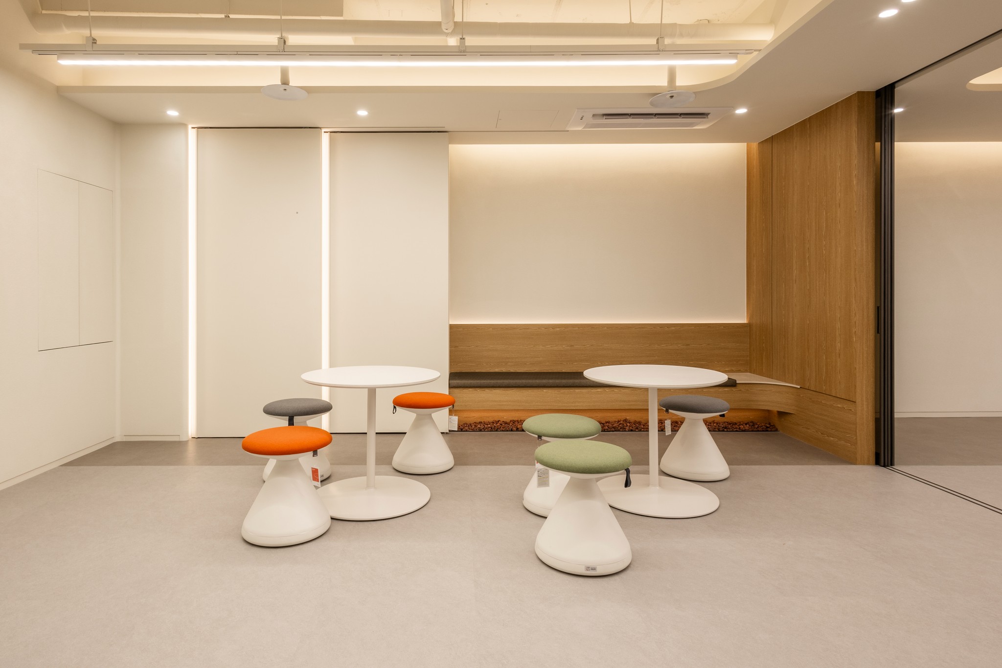 회의실은 비대칭적 패널과 조도 조절 가능한 조명으로 다양한 분위기 연출이 가능하며, 라운지와 식음 공간은 편안한 소파와 자연 소재 마감으로 휴식과 소통을 유도한다.