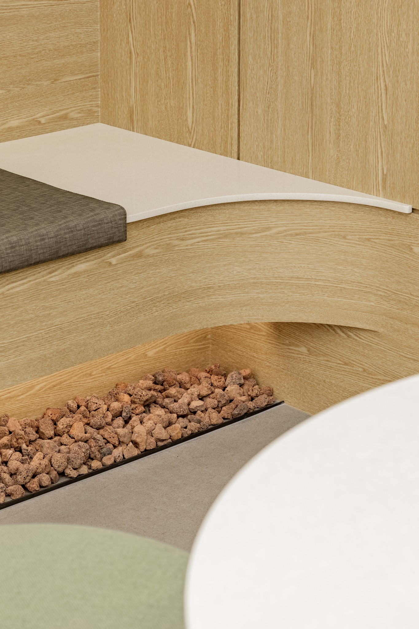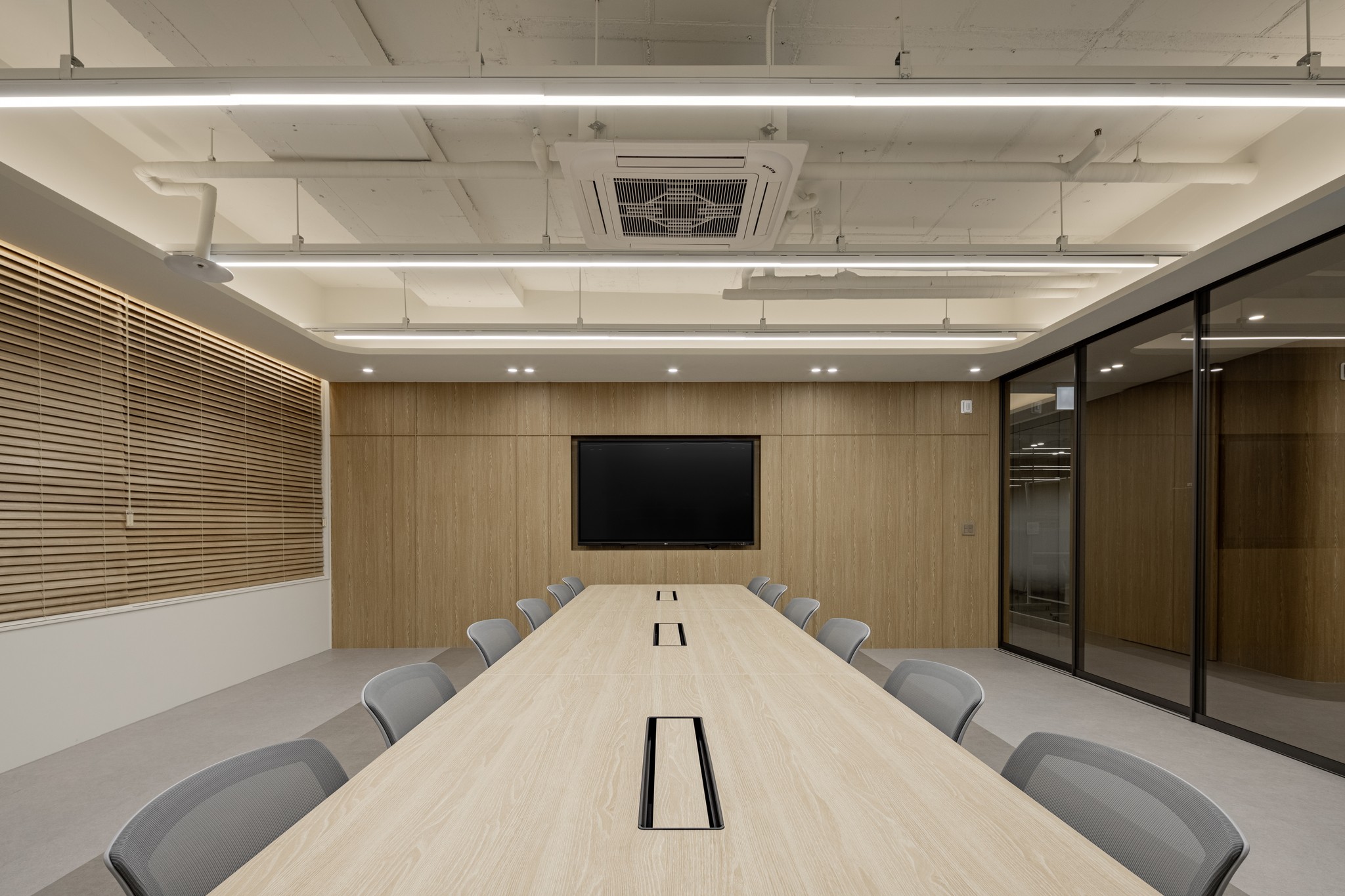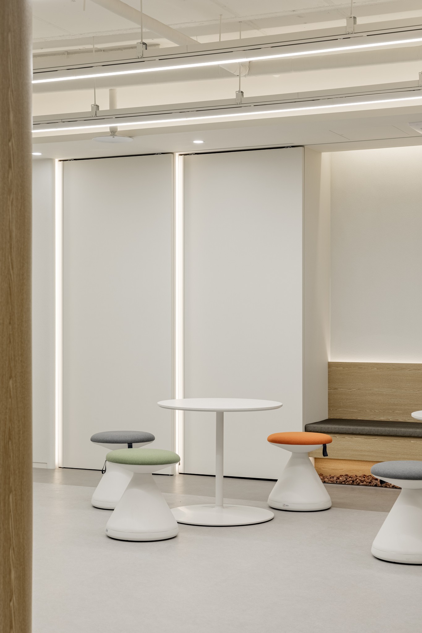 회의실은 비대칭적 패널과 조도 조절 가능한 조명으로 다양한 분위기 연출이 가능하며, 라운지와 식음 공간은 편안한 소파와 자연 소재 마감으로 휴식과 소통을 유도한다.