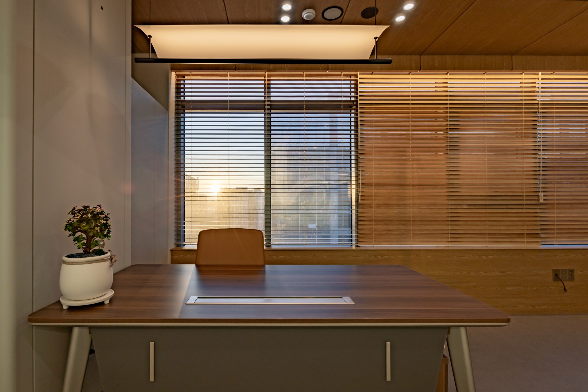 유리 파티션과 구조적 루버를 통해 시선은 흐르되 기능은 구획된다.